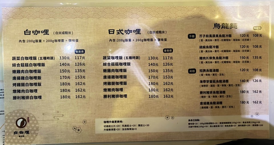 白咖哩豬排飯跟胡麻烏龍冷麵真的很好吃價格也不貴,只希望以後可以規劃內用區就更完美了!