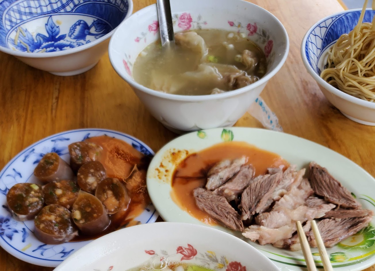 點了醬油麵、麻醬麵、餛飩丸湯,還有小菜粉腸