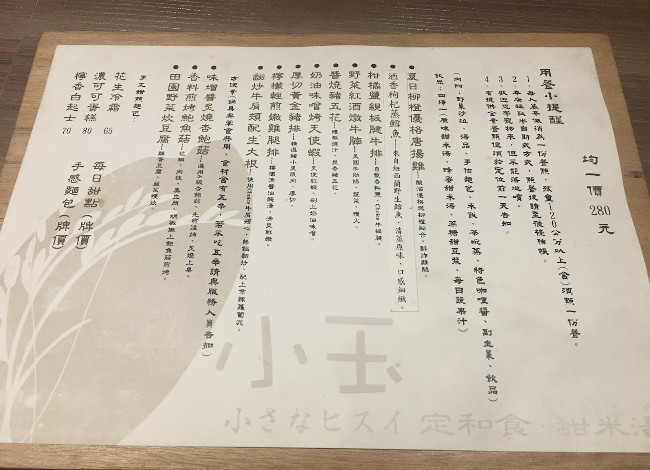 “小玉定和食”,餐點好吃、小菜多樣化,玉米筍與黃金泡菜,忍不住讓人來回夾取好幾趟。 甜米湯令人好奇,品嚐後不失所望,溫和淡雅,是細膩的好滋味。