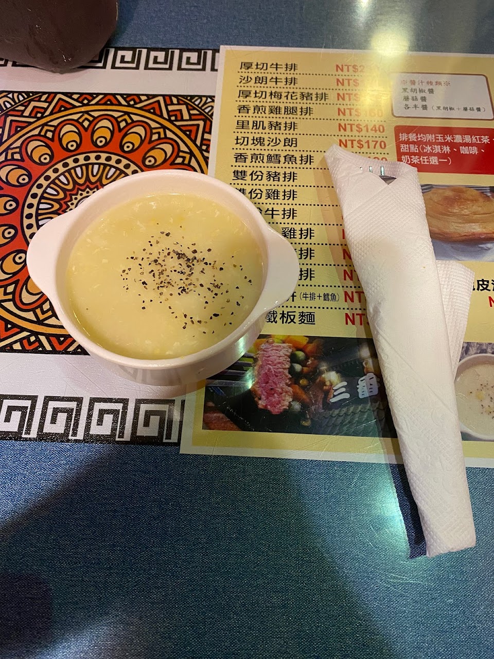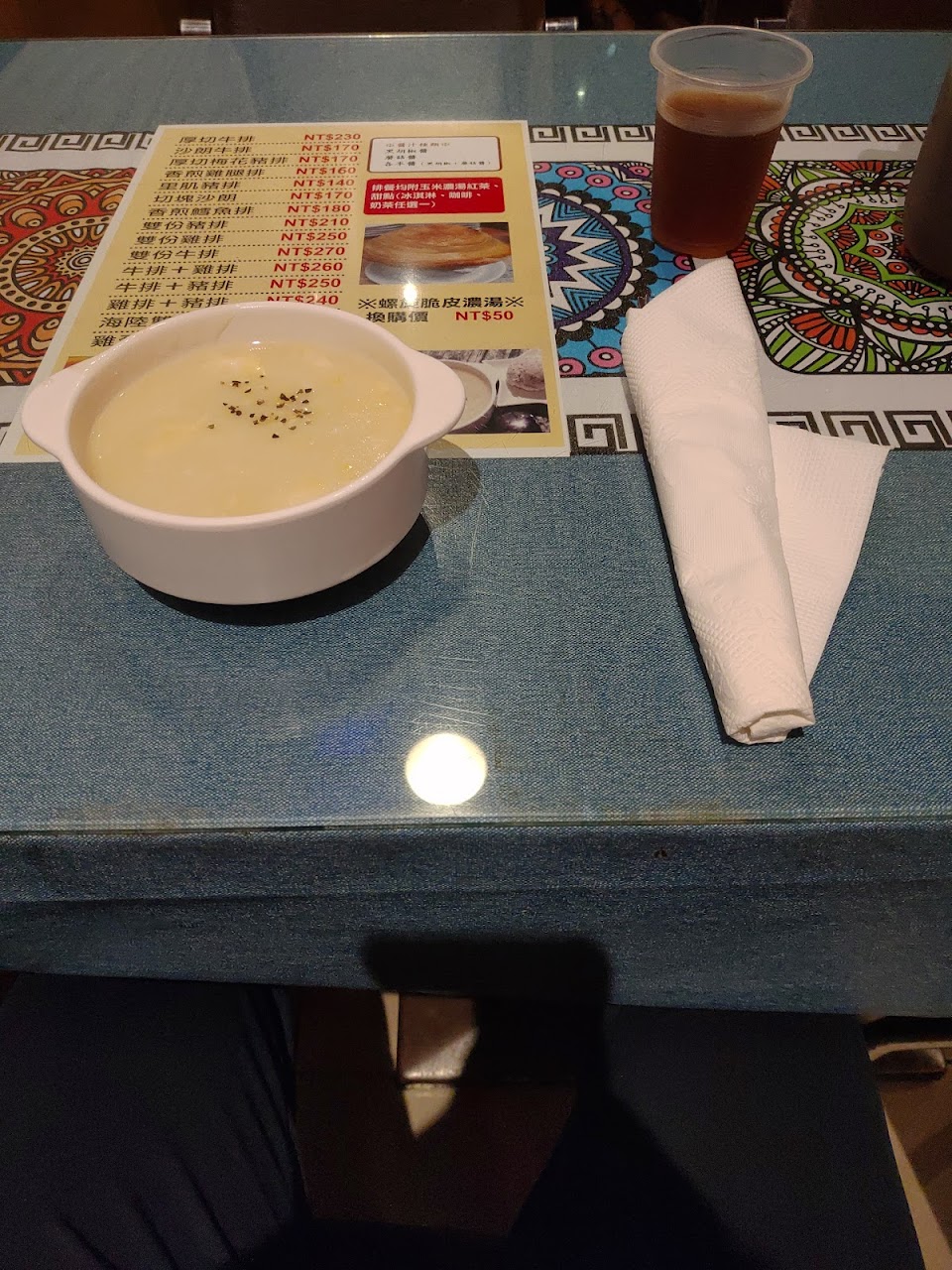 超好吃的啦!肉品有醃過,熟成度佳,附濃湯,飲料及甜點,脆皮濃湯只要50,但很快就沒了欸!