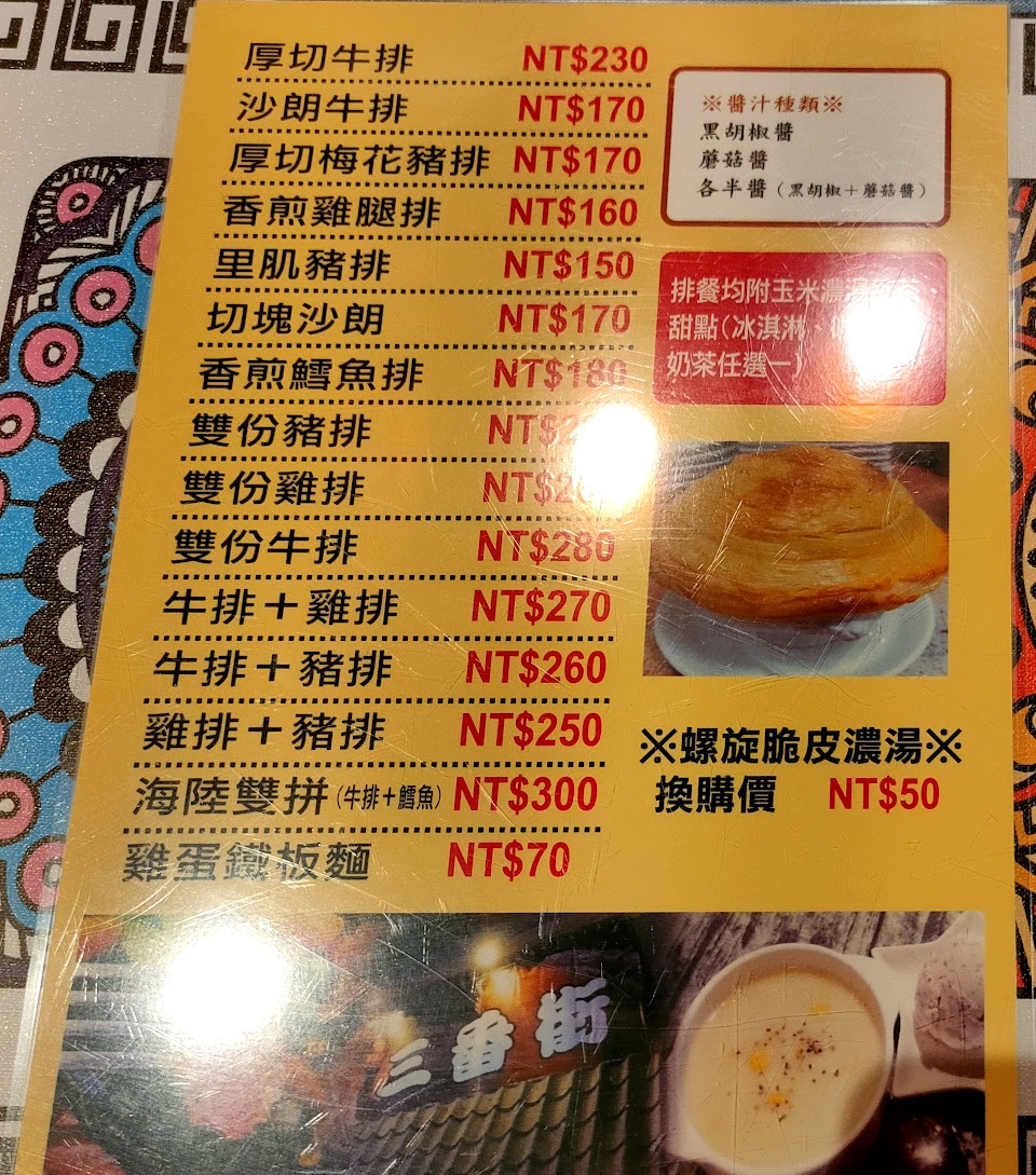 天啊!這間排餐店的「厚切梅花豬排」實在太讓人驚豔了! 之前一直都有經過這家三番街牛排,在東門夜市路口的旁邊,原本一直覺得看起來很普通,感覺就是廉價的排餐店 今天來嚐鮮,我們點了厚切梅花豬排+鱈魚排跟雞排,結果我們ㄧ吃了豬排都忍不住喊了出來:嗯!好吃!! 豬排不大塊,但很厚,看起來很像雞排,一入口非常非常軟嫩,但不是像添加很多加工品的那種,他是有口感有咬勁但又非常軟嫩,感覺是有醃過的,非常好吃,吃了豬排我都吃不了雞排了?? 真的非常大推厚切梅花豬排?? 其他附餐也都很不錯,鐵板麵是細麵的,裡面配料除了一般的三色豆還有花椰菜跟一顆蛋,還有份量不少的豆芽菜,我覺得跟麵一起吃口感滿豐富的,不那麼膩,也比較清爽一點,而且他麵裡面還有肉醬,就是看得到碎肉的那種,所以我覺得口味已經算是滿夠味的,不用另外加調味料 「在此分享一個吃排餐的小技巧,排餐上桌的時候鐵板一定是有熱度的,記得把肉排墊在配料上麵或蛋上,不要直接接觸鐵板,不然沒有馬上吃的話就會過熟變老不好吃喔~」 然後還有附一般濃湯跟甜點(冰淇淋、咖啡、奶茶三選一)冰淇淋就是一般的那種桶裝冰淇淋,濃湯裡的料很實在,有玉米火腿丁還有蝦仁!加$50才有脆皮螺旋濃湯喔~ 整體來說很不錯!這個價位這樣的品質是非常好的,老闆娘服務也很親切,推推?