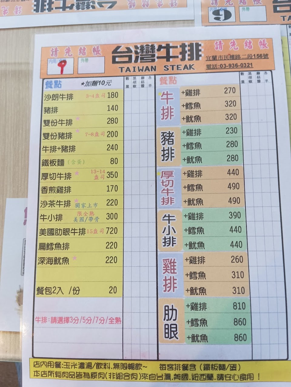 餐點口味OK,除了湯超鹹這價位沒啥好挑剔。但菜單設計超爛,去八個人如果點同道餐就完了,畫完菜單不知道幾分熟跟醬是誰的,只能點餐的人記得所有人的熟度或醬料,或者是客人一位一位排隊點點餐,菜單沒用。建議醬料別跟著餐走,這樣就不用管三種醬配的是七分還五分熟的,又或者學別地方作法,店員自行點餐,自己做記號哪個餐是配哪種醬。不然就重新設計菜單寫法吧。