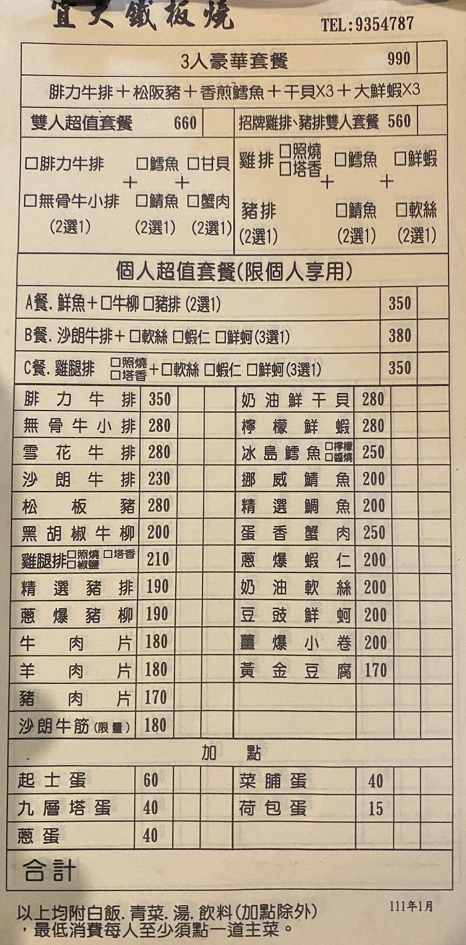 沒有用保溫錫箔紙,菜放在菜盤吹冷氣一下就冷了,失去了吃鐵板燒的意義 雞腿肉煎得過硬,其餘的都還可以,口味偏重 價格偏高 餐點:3 服務:4 氣氛:3