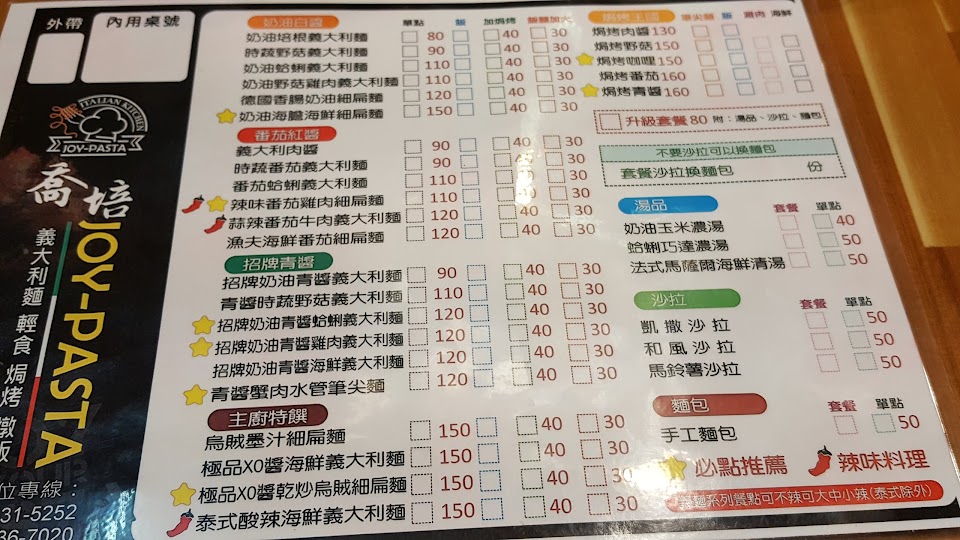 吃過幾次的經驗,比較推薦辣味蕃茄雞肉細扁麵和招牌奶油青醬蛤蜊義大利麵(小孩適合),80元可升級套餐,套餐含湯、沙拉和麵包,不要沙拉可用麵包取代。