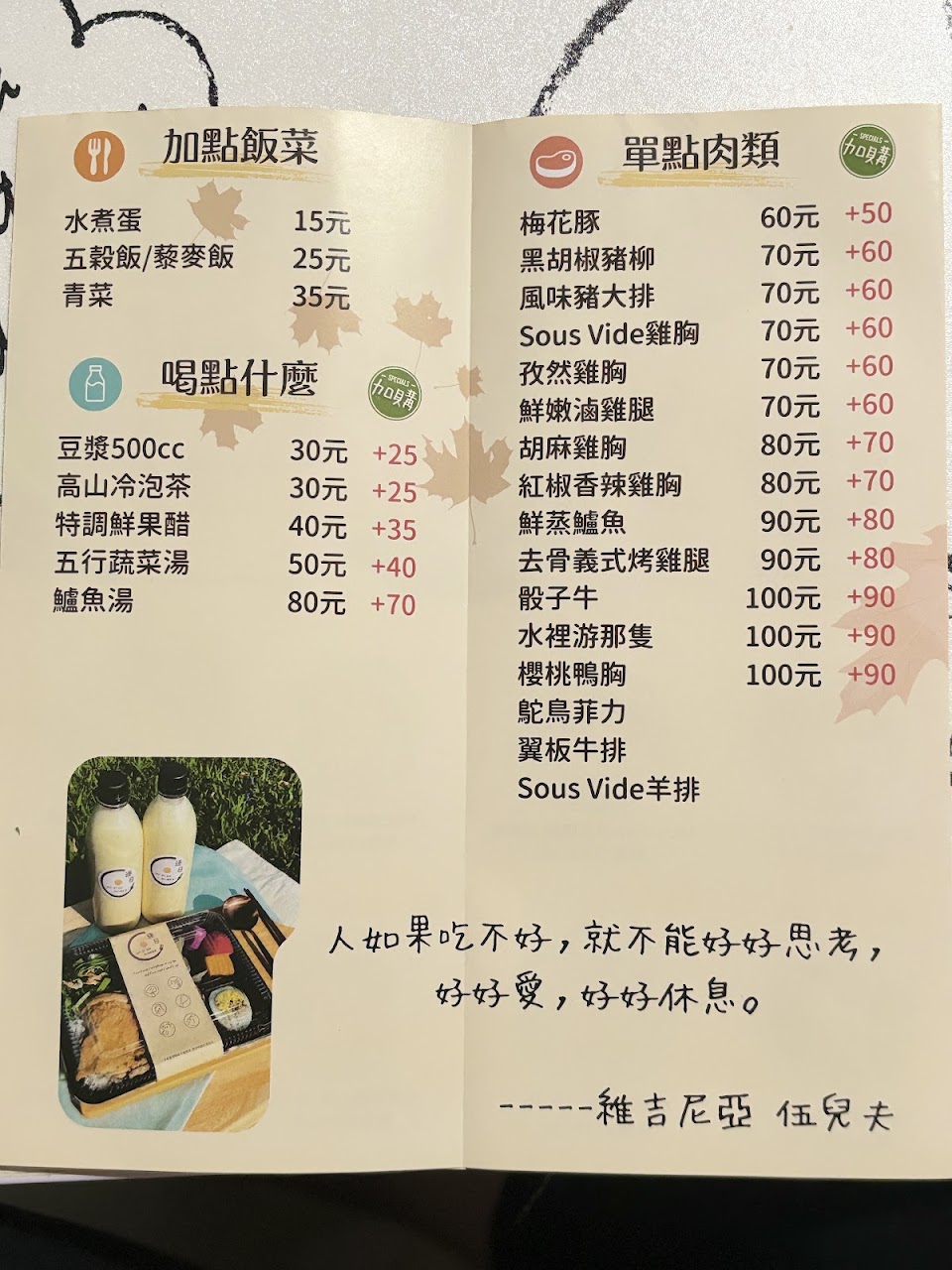 外帶吃過四五次了~餐點配菜都會更換,非常用心。唯有一開始吃舒肥雞胸覺得可以煮熟一點(有點生的口感會怕怕的),還有一次吃到小小的蛋殼以外。整體來說很好吃、份量也足夠,可以line預先點餐很方便?? …