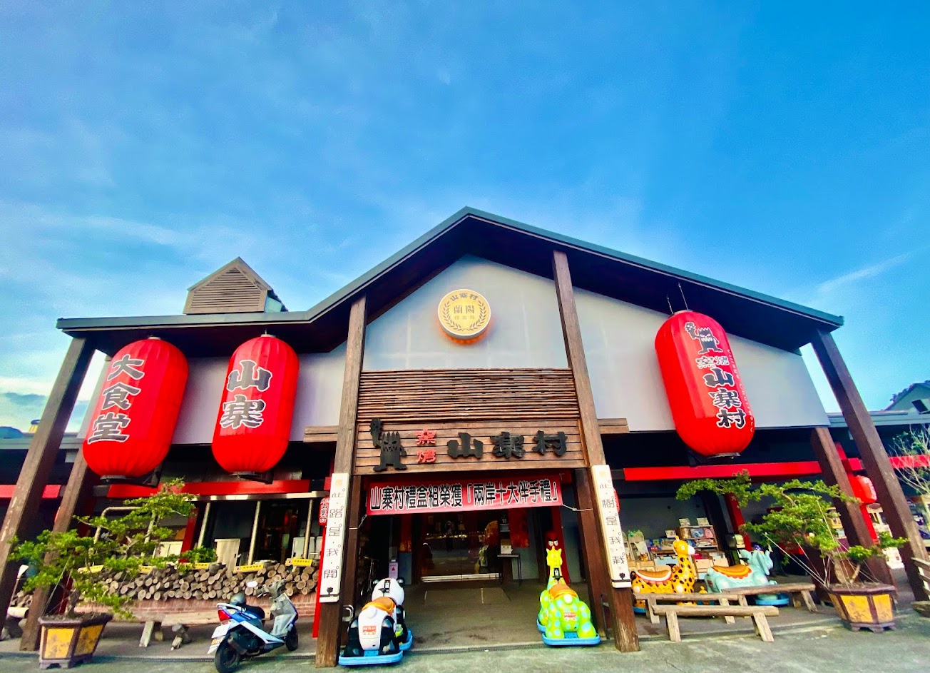 ?宜蘭景點 ?窯烤山寨村 窯烤山寨村位於上次介紹的景點附近 ?是一家極具特色的窯烤餐廳兼伴手禮店 ?日式木造建築搭配超大的火紅燈籠 ?餐廳裡頭還有巨大的紅色赤魁拿著惡棍麵包(⁎⁍̴̛ᴗ⁍̴̛⁎) 整個園區佈景充滿濃濃的日本味! 更是像極了南投溪頭的妖怪村~