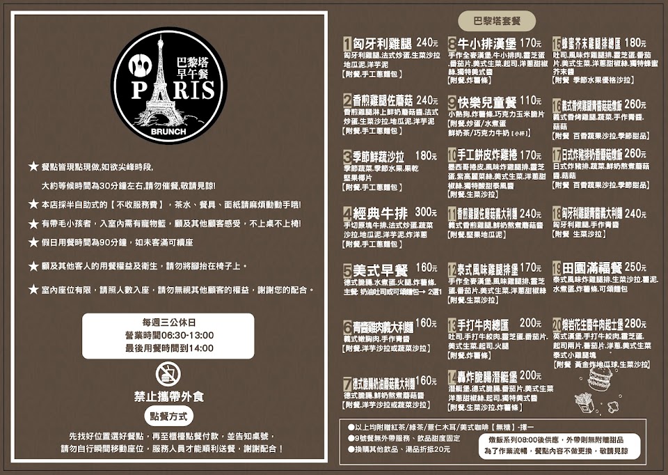 餐點美味,氛圍悠閒,彷若蜜月時身在巴黎鐵塔下用餐 服務 內用 餐點類型 早午餐 平均每人消費金額 $200-400 餐點:5 服務:5 氣氛:5 建議的餐點 蜂蜜芥末雞腿排總匯, 蜂蜜芥末雞腿排總匯 牛小排漢堡 親子友善程度 自助餐具適合兒童及大人使用,無低消,環境清幽,有4本兒童讀物可看。