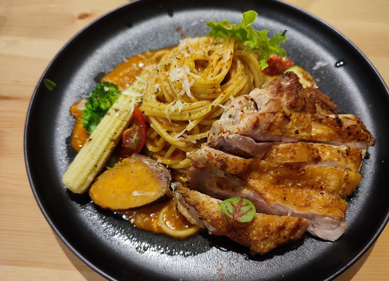 用餐環境簡單乾淨,餐點選擇也不算少,義大利麵煮的剛剛好,份量也足夠,口味上不錯,雞腿皮很脆!這天的附湯是地瓜濃湯,調味適宜,而且蠻大碗的,整體價格也不算高,蠻適合和朋友一起享用。