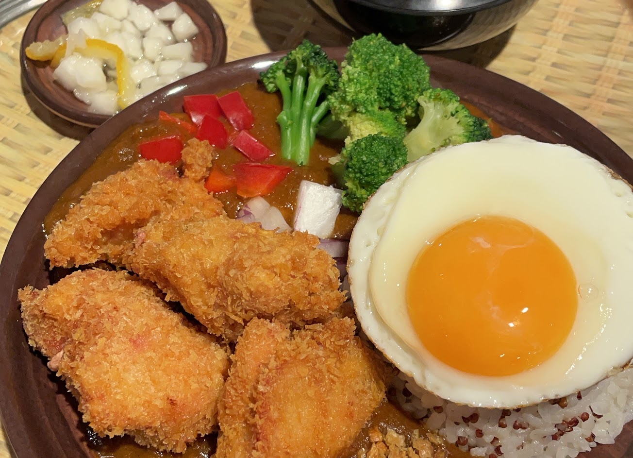 小菜柚子醃蘿蔔讓人驚豔,咖喱是我愛的偏甜口味,半熟蛋加上藜麥飯整個完美