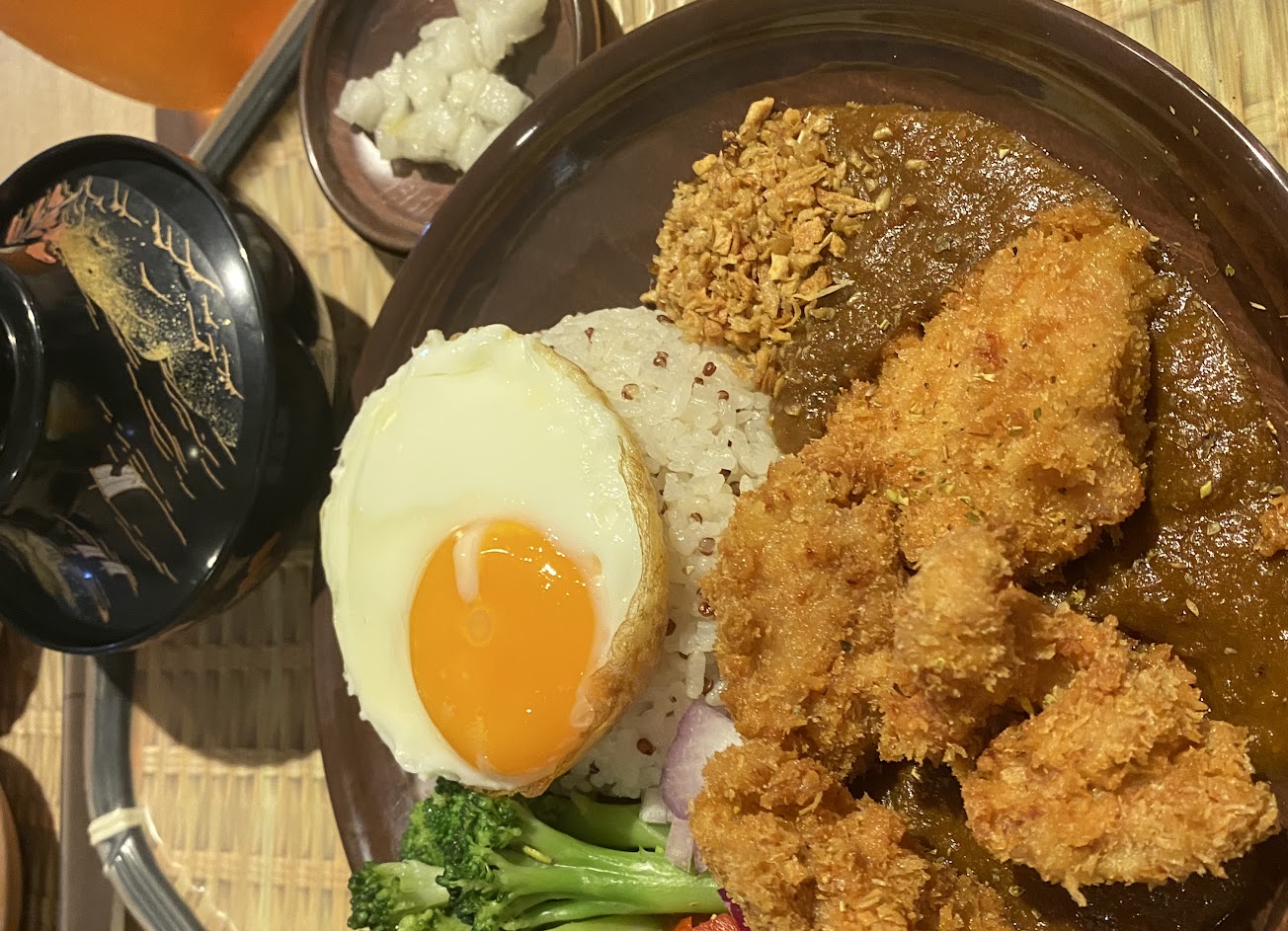 咖哩的辛辣味很不錯,能吃到蔬菜和咖哩融合的清甜,牛肉燉的軟爛很入味,煎蛋微焦的底部超級適合搭咖哩跟白飯。
