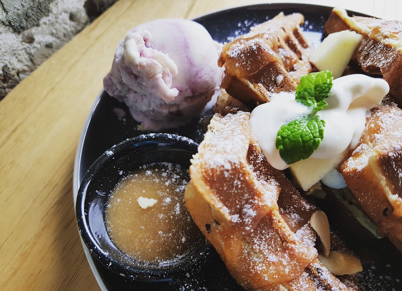 我點女王粉紅蜜蘋鬆餅 鬆餅裡暗藏玄機 夾了麻糬跟蘋果切片 外層脆脆的,不是硬的很難咬 內層因為有麻糬更柔軟卻不失嚼勁 再加上蘋果切片微甜微酸的滋味 旁邊的醬是石榴醬很厲害! 我覺得情侶一份剛好唷!