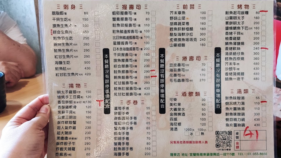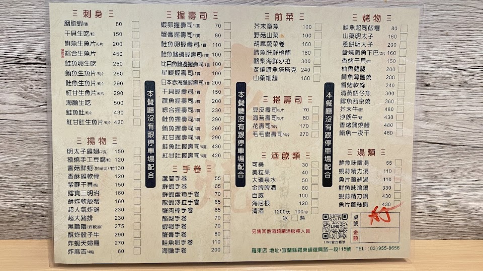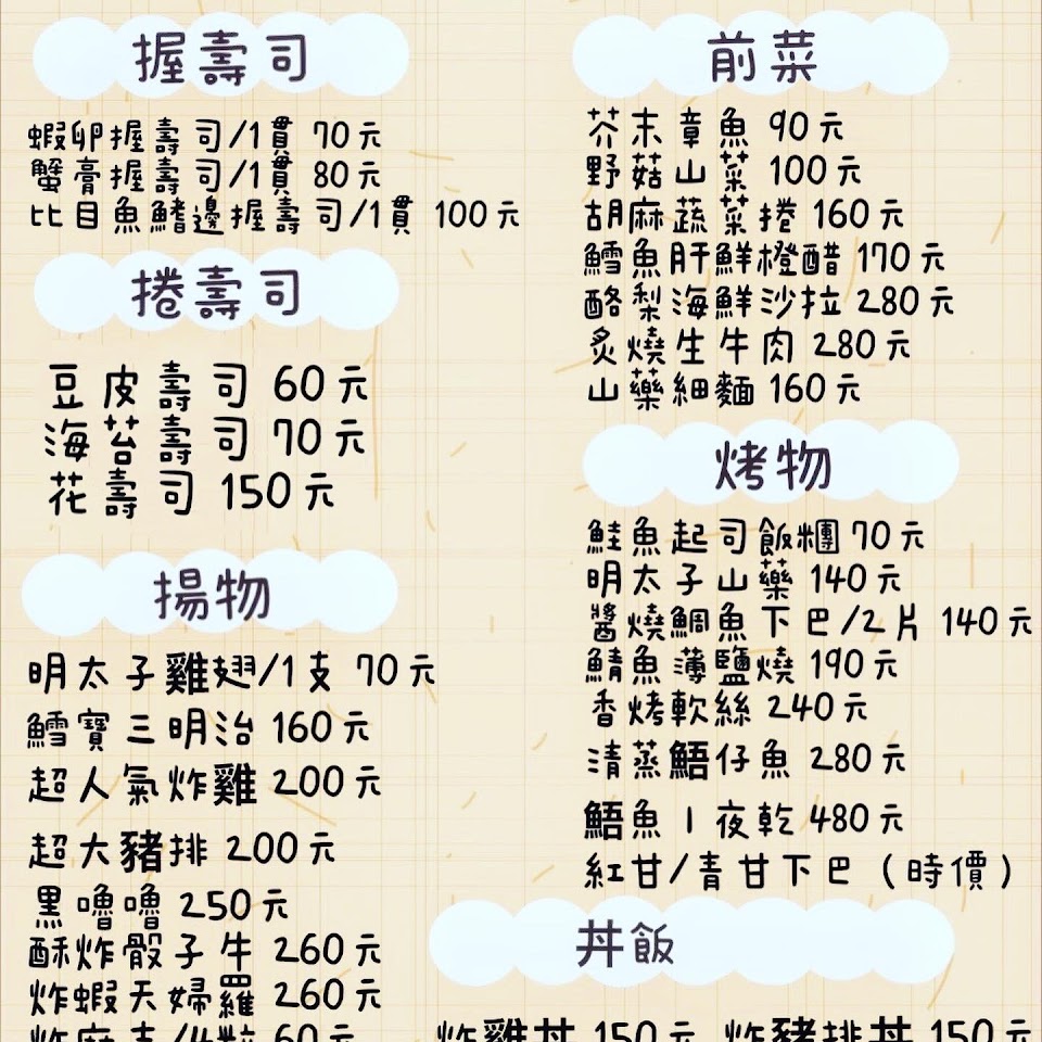 之前看很多海鮮前輩推薦,特地在年初三帶家人來,綜合生魚片需要提前預訂,4人用餐,原先預訂2份生魚片,到現場被告知份量會太多,立馬取消一份,綜合生魚片份量真的很多,內有種類超過12種,甜蝦很大很甜,可惜只有一隻、牡蠣新鮮肥美不腥,生魚片每片體積不大,有些是熟成過,但我沒辦法認識每一魚種(若能標示會更好),一般鮪魚鮭魚紅甘等常見的都有,魚肉新鮮筋膜很少,芥末是新鮮現磨,下墊紫蘇葉,符合日料店標準。另外加點了涼拌章魚、紅甘握壽司、比目魚握壽司、黑嚕嚕(炸軟絲)、毛毛蟲壽司、酥炸河䐁、芥末牛、川燙斑節蝦和薑絲魚片湯,每一樣都在水準之上,個人覺得醋飯不夠出色,米飯一般、甜酸度不出彩,飲料鮮榨柳橙很好。用餐環境乾淨,座位不算多,只有2間包廂,整體而言,海鮮食材新鮮、CP值很高,推推?