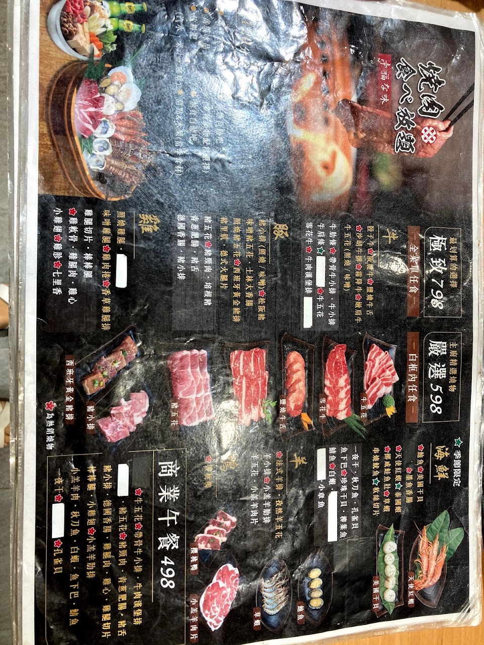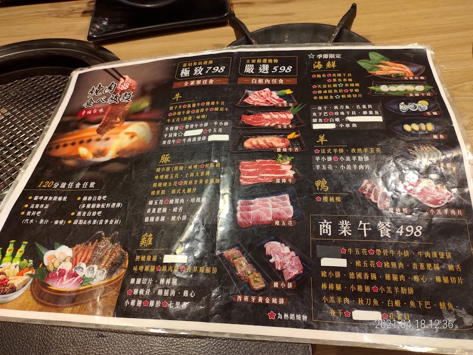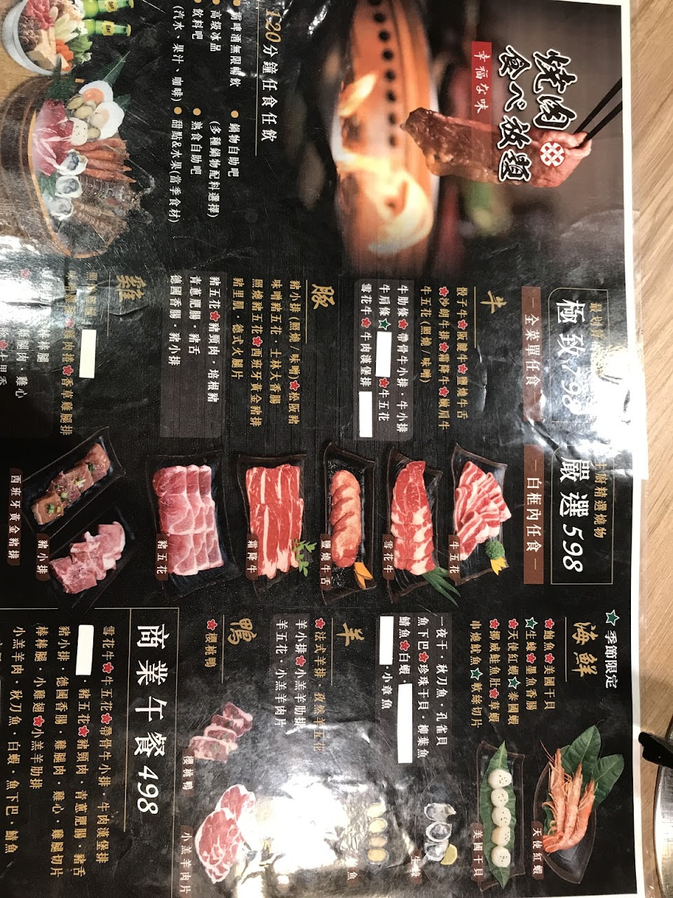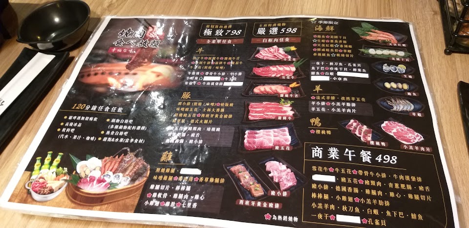 含服務費一個大人晚餐快近1000元,我們這桌約莫五個大人二個小孩400元左右,肉質很失望 牛肉幾乎感覺都重組肉,羊叻條根本無法咬比口香糖還失敗,饕客們真的可以考慮 相信我 老闆如果看到這封信 趕快重新整理肉的品質吧 更何況還有更高價位的 一個人可能將近1200元 不用省這肉的品質 有時候人們只是吃氣氛跟感覺不是真的吃到撐 一桌下來還是有賺頭啦!快點選品質好一點的肉吧 虧地理位置還不錯 服務人員很好 宜蘭幾乎任何燒烤吃到飽cp都打敗你們了 朋友還說我們怎麼會選這間