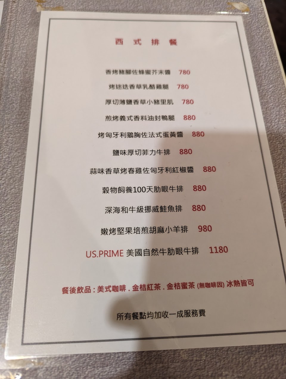 餐廳風格不太屬新穎的裝潢,但也滿有氛圍 看評論滿多人說有霉味,我們倒是覺得還好 當天的服務也很好,點餐說明也很詳細 晚上用餐同時也有其他組客人 但上餐速度不慢,餐點大致上還不錯 排餐部分我們點的也都覺得滿好吃 牛肉沒有過多筋膜的問題~ 服務 內用 餐點類型 晚餐 平均每人消費金額 $800-1,000 餐點:4 服務:4 氣氛:4