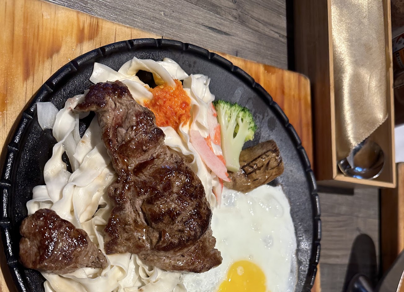 點了菲力和肋眼牛排,菲力選了五分熟,但外層太焦了,吃起來很硬,整個口感不佳,肋眼相對起來好一些,但也就普通水準;鐵板麵加了招牌辣醬後還是沒什麼味道,麵條有點生硬,不太好吃。