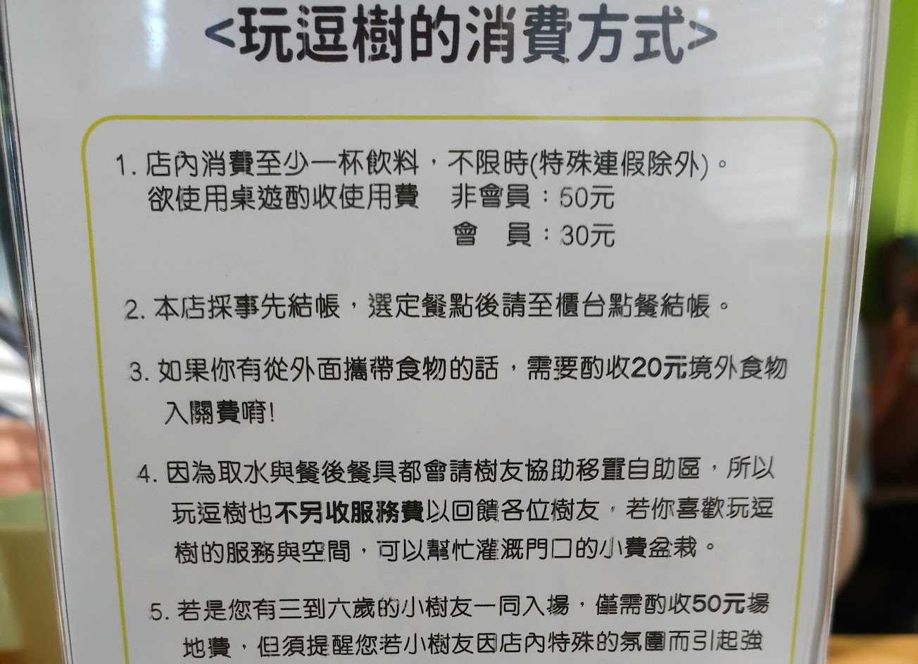 需要買一份餐點或飲料當作低消,餐點或飲料都是大約150元上下,想要玩桌遊的話需多付50元,可以玩4小時。 環境優美,餐點好吃,但假日工作人員會比較忙,沒有時間做桌遊教學,但是服務還算可以。
