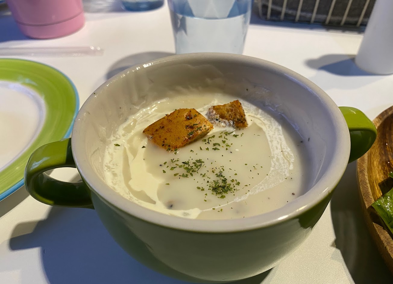 餐點很好吃,蒜炒雞肉義大利麵加麵後很大份,吃好飽!奶油松露野菇燉飯的松露味很濃厚,菇菇給的很多,可能比飯還多呢!濃湯奶味濃郁,炸薯條跟洋蔥圈也好好吃,整體來說很有水準!