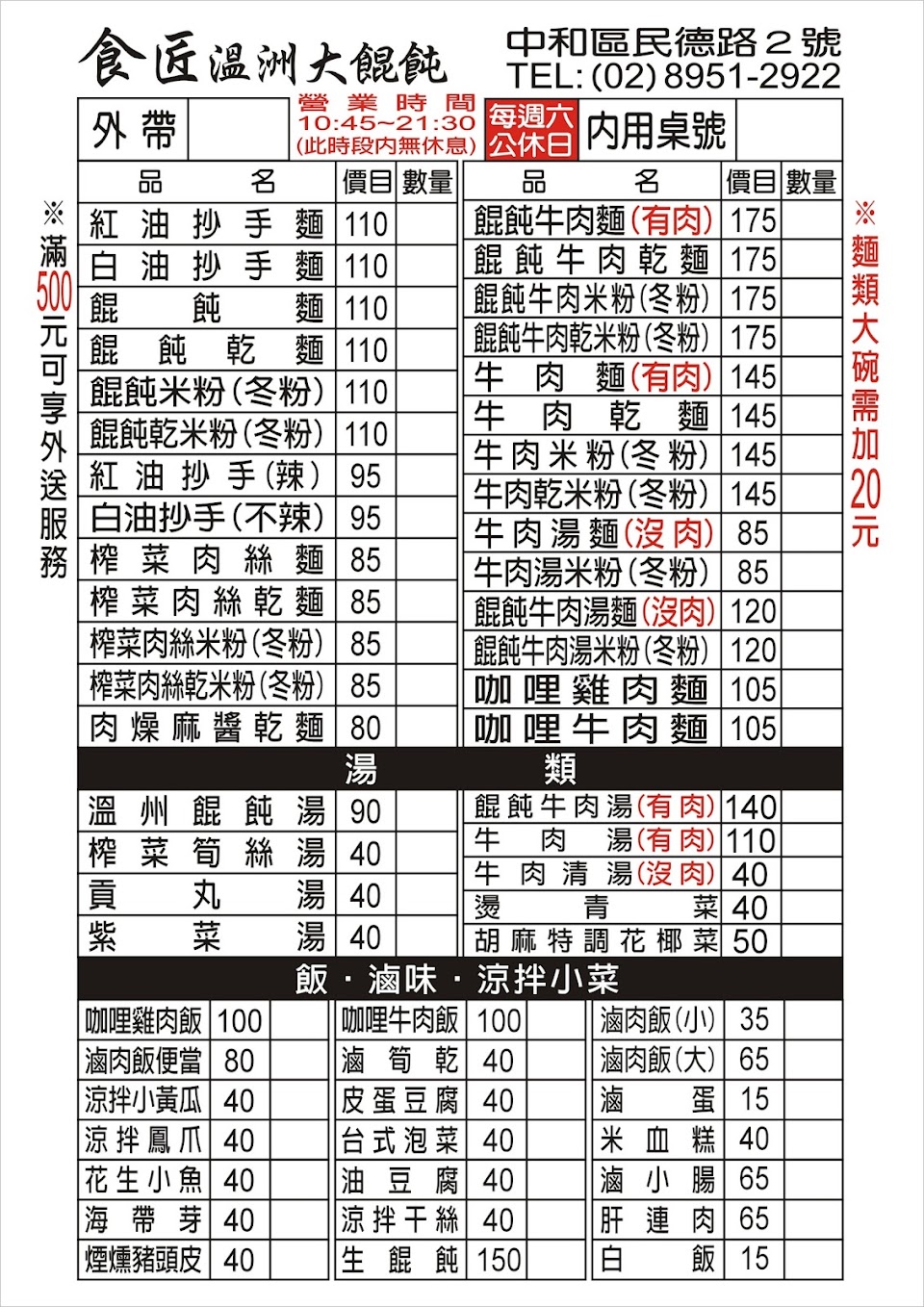 2024最新在地推薦餐廳的菜單_食匠牛肉麵溫州大餛飩的菜單、圖片