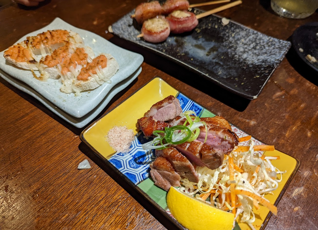 服務人員很親切有趣,用手機點餐很方便,櫻花蝦炒飯份量太巨大,蛤蜊湯很鮮甜大推,椒麻雞的雞肉很嫩很好吃,椒麻醬就顯得普通不出色,明太子雞腿肉的雞腿烤得太嫩太水,許多串燒品項都烤得太嫩,但個人喜好喜歡再熟跟再乾一點的串燒,所以會覺得有些烤的不夠透,醬汁口味偏甜,整體CP值不錯