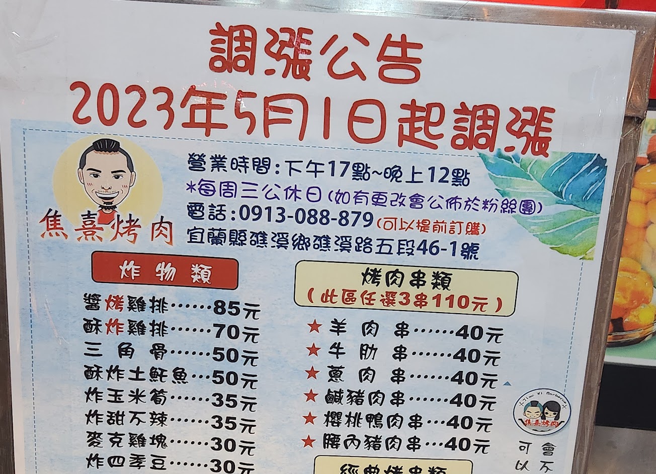 現在每週來礁溪的新寵。以前都排阿亮燒烤,但假日人多不想等。無意間嘗試到焦熹烤肉,不只烤物,連炸物都好吃!變成來礁溪必吃的行程之一了。