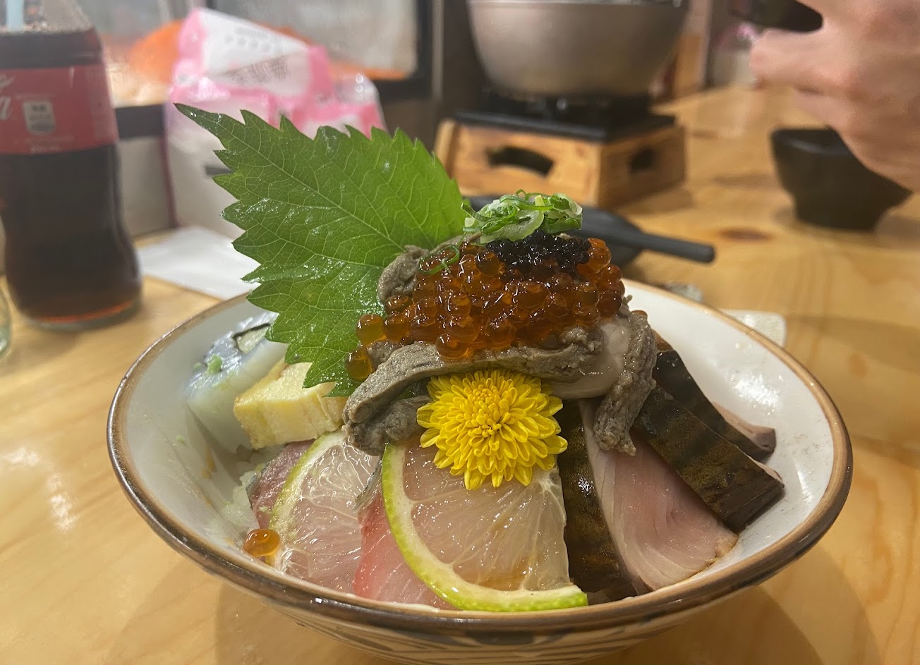 炙燒鮭魚壽司也變超難吃,鮭魚一樣爛爛的上面的鮭魚卵也是暗橘色的不新鮮的感覺,下面的壽司感覺像是先備好的,壽司裡的肉鬆整個濕掉結成一團,不像現做的,壽司的飯呈現半透明的是冰過嗎?這我不太清楚但不好吃就是了,包壽司的海苔也是濕濕的,總結感覺不新鮮,但一夜干那個滿好吃的,一顆星給裝潢氣氛,一顆星給一夜干,其他很失望,跟第一次來吃的時候差很多,不知道是換廚師還是怎樣,反正從我的礁溪第一名日料移除了?