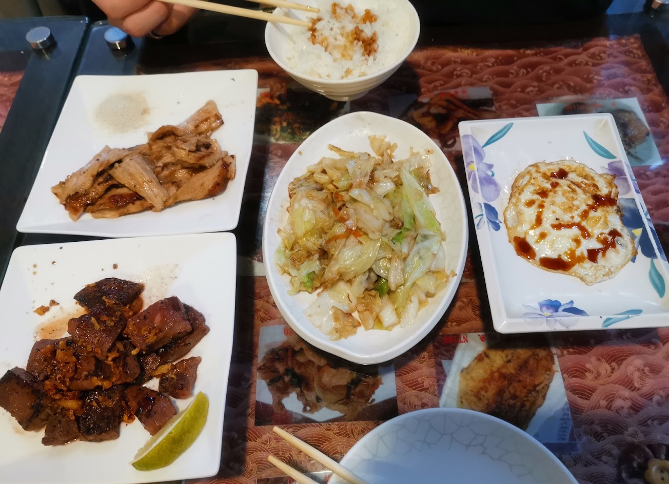有附豆芽菜和高麗菜,白飯飲料湯自取,平價,沒有特別好吃也不難吃