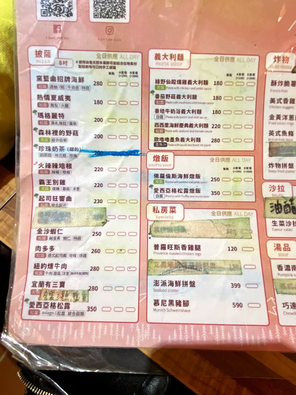 據說是使用自養天然酵母,結合當地食材,製作出來的手工披薩,加上Q彈料多的義大利麵,還有真材實料的南瓜濃湯,蔬菜新鮮的生菜沙拉,好喝且不會過甜的冰紅茶,再搭配味道濃郁的起司條,每樣都是好吃的!服務態度也是很好,小姐還會主動幫忙拍照,門外也貼心的放了兩把愛心傘給顧客借用,以備不時之需!不過麵的份量略少,起司條對起司控的我,小巧的份量好像不夠吃!價格也偏高一些!偶爾來吃一次還是可以的!起司條和麻糬雪糕雖然是市售產品,但也是很好吃!算是很成功的異業結盟吧!墨魚麵很好吃!