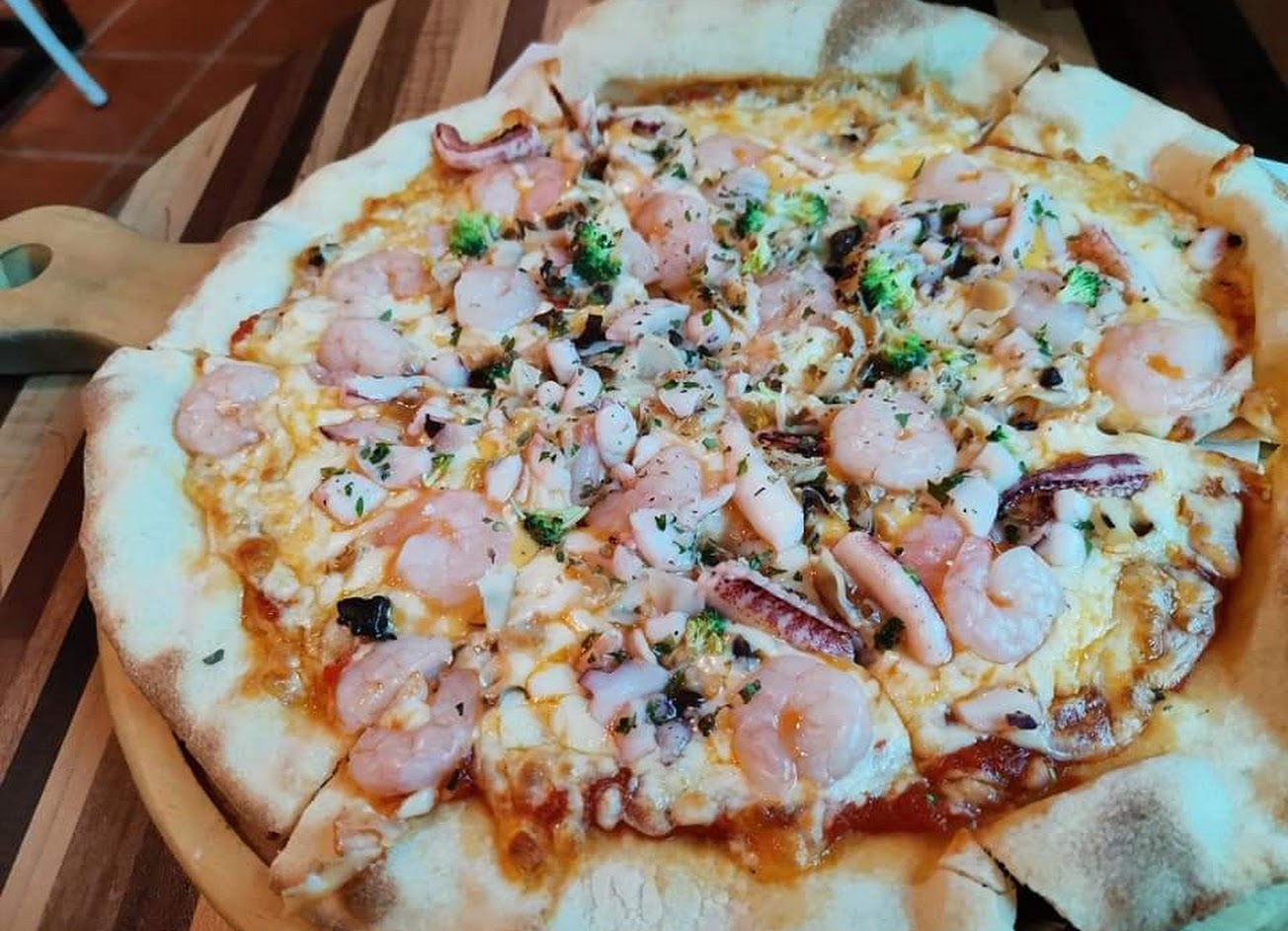 店家外頭有自己的的停車空間,不大但也能容納10多輛的車,這家最吸引人的莫過于屋外的玻璃屋吧!戶外雖然不大,但還是有很多適合拍照的小景點,一進門就有小型的小池流水養殖小小魚,還有歇息的小吊掛椅看起來很是愜意,還有一些木製的小型裝飾藝術,給人有不少的拍攝空間,不過人多的話可能就會有點擁擠。店內很特別,烤爐的披薩製作區是透明話的設計,一眼望去就能看見店內人員正在製造披薩的整個過程,感覺很乾淨舒服,餐點真的好吃,店員推薦的有瑪格麗特披薩和海鮮披薩,墨魚麵其實也很不錯,整支墨魚擺盤上桌其實還蠻吸睛的,我個人是很喜歡瑪格麗特披薩。屋內有冷氣的座位並不多,不過戶外其實也有座位的,如果人多要聚餐的話,建議可以先訂位,避免屋內有冷氣的座位排不到,要嘛就是忍受高溫在戶外用餐,天氣熱等待的時間讓人熱的難受。