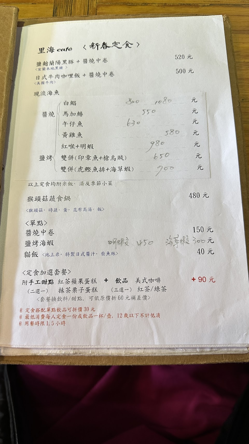 ?【里海咖啡】提供的每日現流魚定食菜單就在資料夾裡面,因為每天補來的魚不同,會有什麼選項每天都不一樣。海魚的料理方式可以選擇醬燒或是鹽烤,價位依照不同於種、不同尺寸而不一樣。