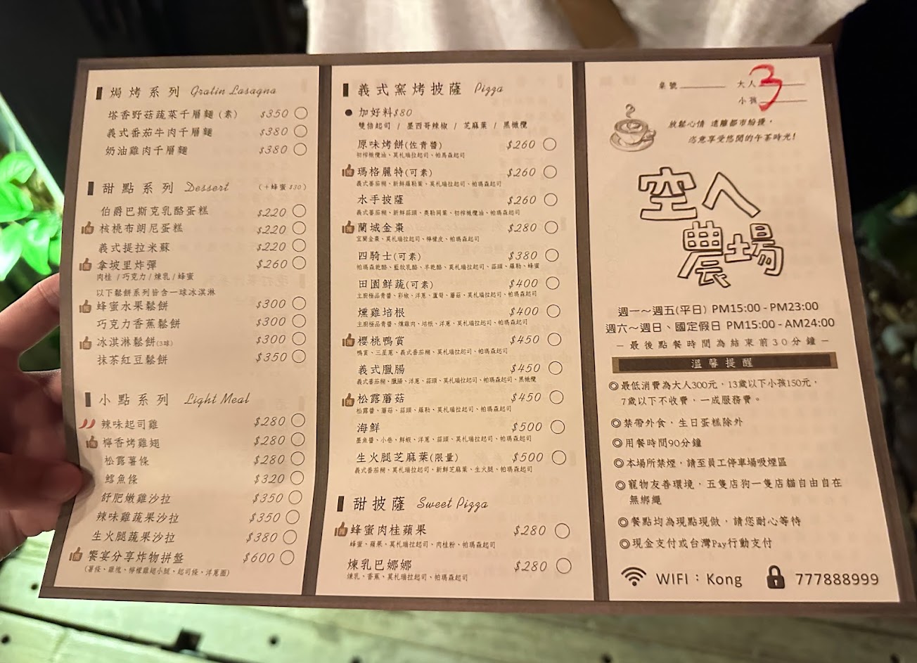 用餐時間90分鐘,大人低消300,小孩150,7歲以下不用低消,餐點價格偏貴,披薩$260~$500,鬆餅$300起跳,飲料$200起跳,但配美景無價!