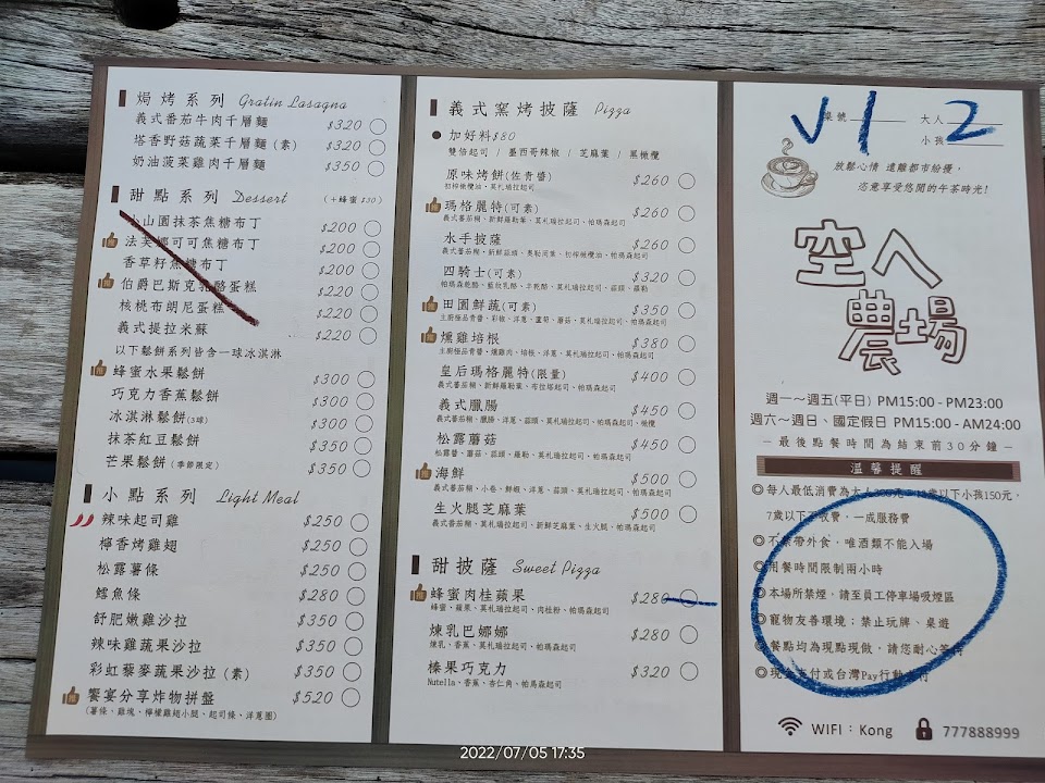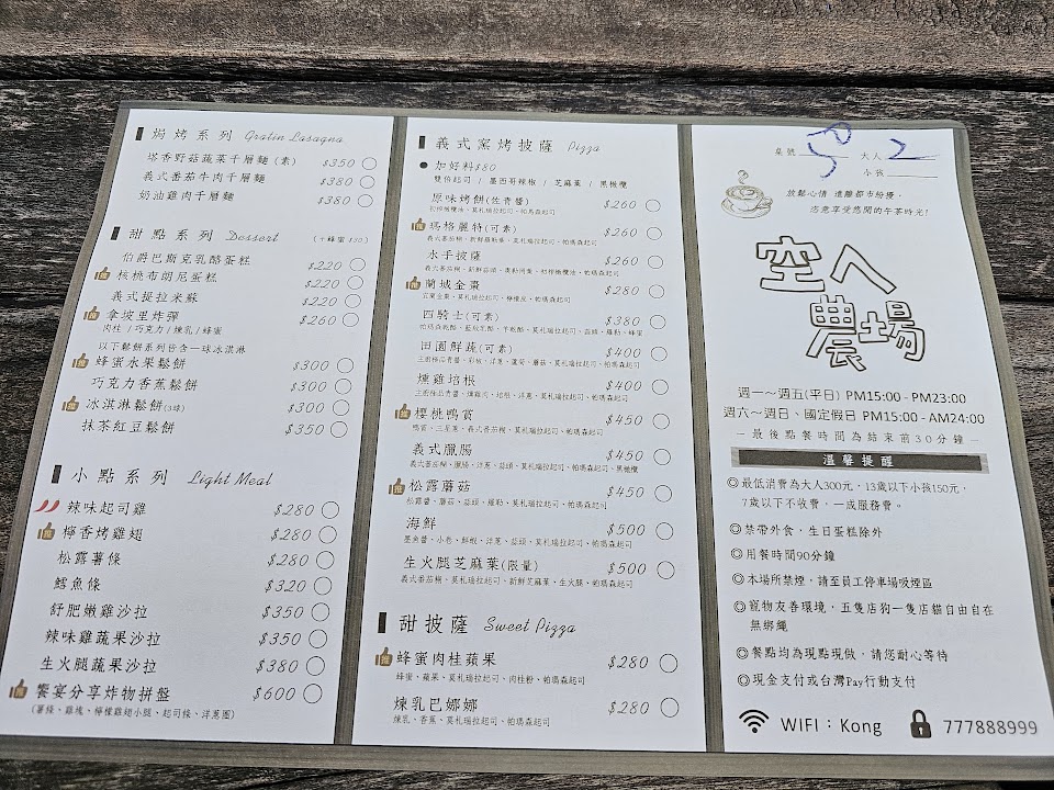 空ㄟ農場是位於在山頂上的一家景觀餐廳要去這一家餐廳必須在山下的接駁處坐他們的接駁車約10分鐘左右才能到達他們的餐廳接駁處的地方有停車位平常接駁處排隊等上車的約30分鐘左右這家餐廳的餐點普通價位偏高,因為有低消建議吃飽飯再上去點飲料即可主推的Pizza被過度的渲染了、所以來這邊看看夜景體驗一下氛圍就好了、這是一家標準的景觀餐廳。