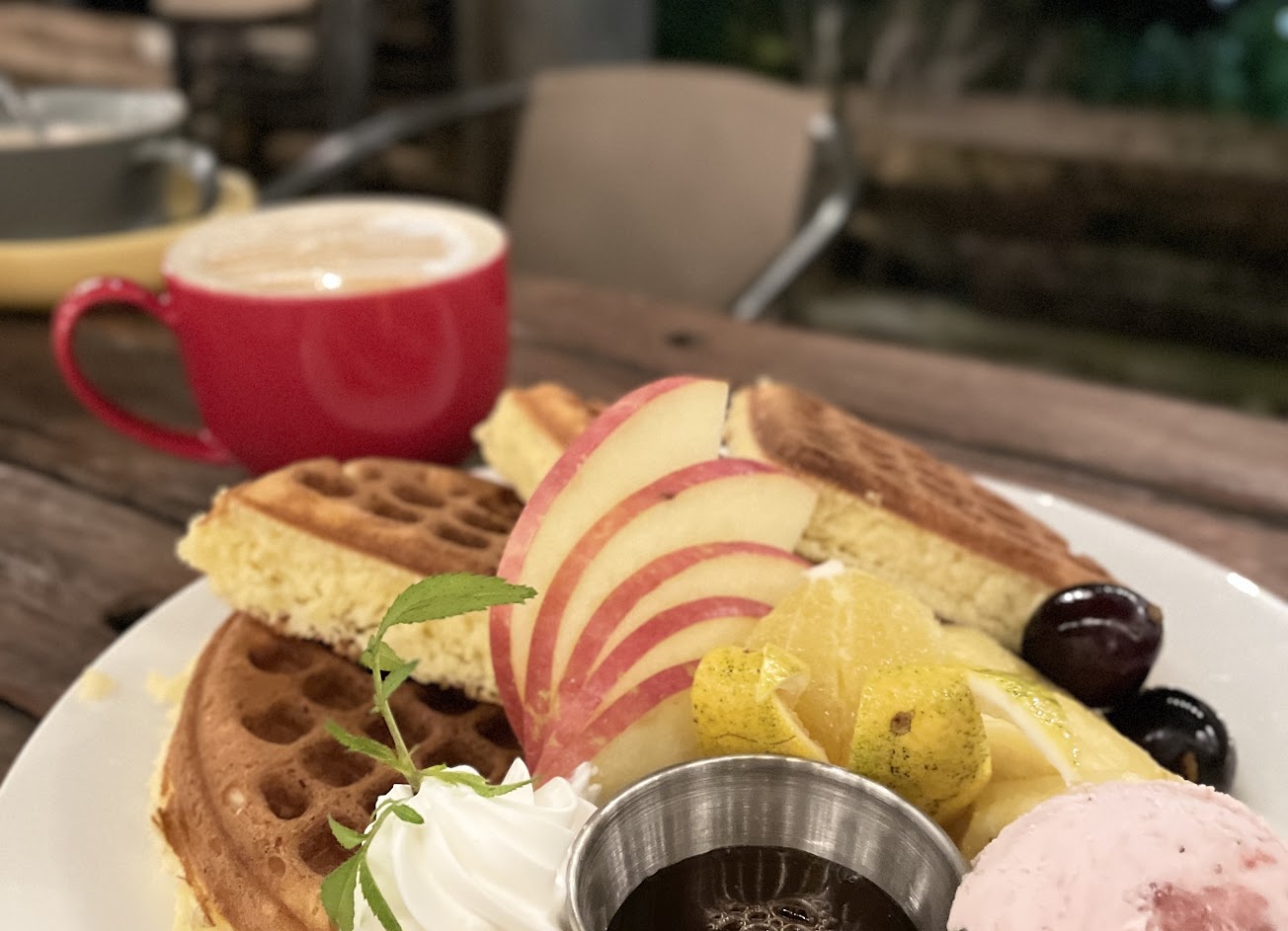 4塊鬆餅配上季節水果、蜂蜜、鮮奶油及冰淇淋