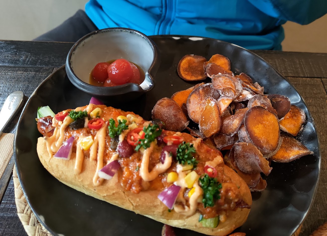 拍照的部分,個人覺得不是真的特別美..能夠拍攝的位置也不算多。以餐點的cp值來說,算是偏貴了一些。就以我點的這個墨西哥辣醬熱狗堡來說,熱狗好小一條…應該是主體辣醬的味也被洋蔥搶光了,害我以為是洋蔥堡,不太建議點。當作下午茶,走走晃晃,勉強及格。