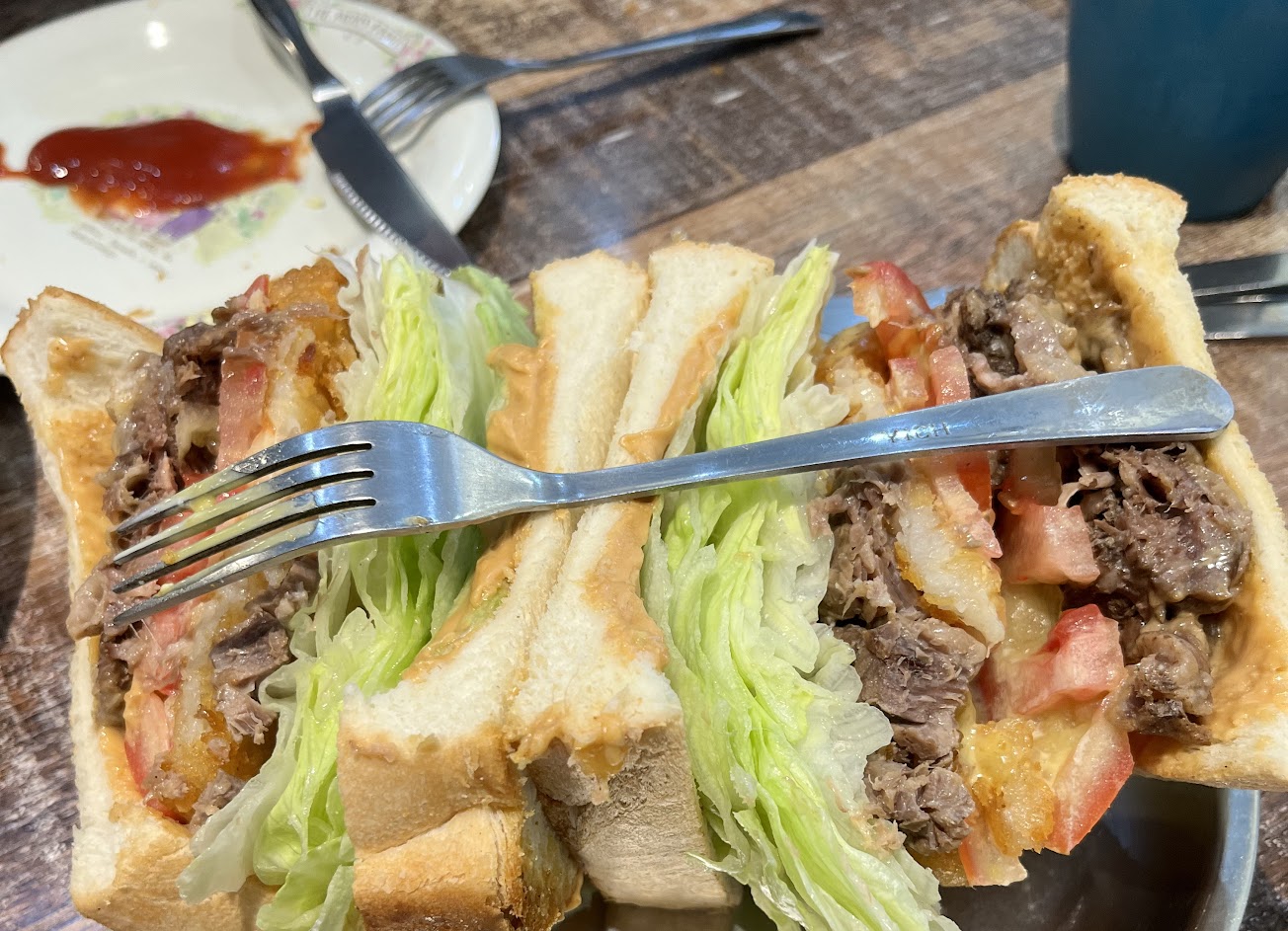 很厚實的三明治,牛肋條份量很夠,除了生菜、番茄還有薯餅,配上花生醬相當完美的早餐☺️