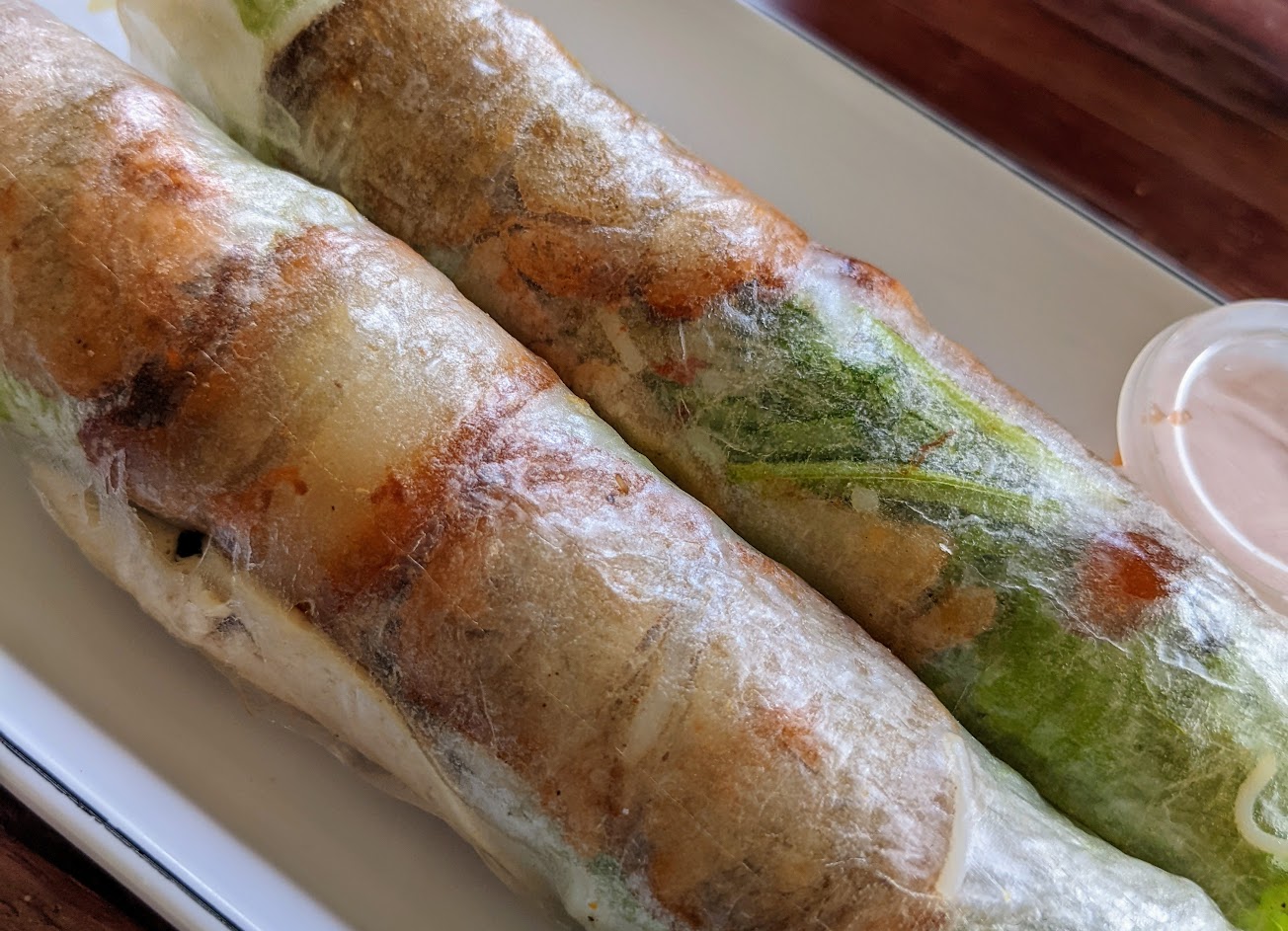 法國麵包體酥脆,加上小黃瓜、紅蘿蔔、香菜、雞肉、醬料魚露味道還有醃製白蘿蔔內餡滿滿,當正餐很可以。生春卷除了標配的米線生菜等,包的豬肉不是常吃的豬肉片,是煙燻過的肉塊像豬頭皮,本來就是想嚐清淡的配料,這麼有創意的豬頭皮配料味道過鹹,已經不適合再沾醬料吃,口味不太適應。