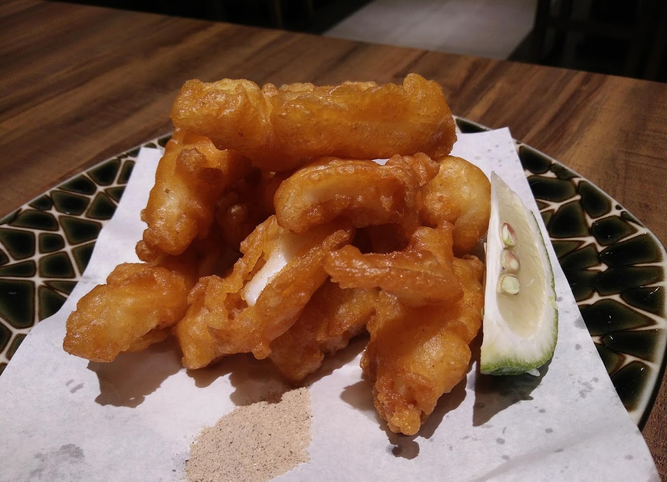 吃完拉麵後覺得很口渴……炸魷魚有點膩、生魚片尚可