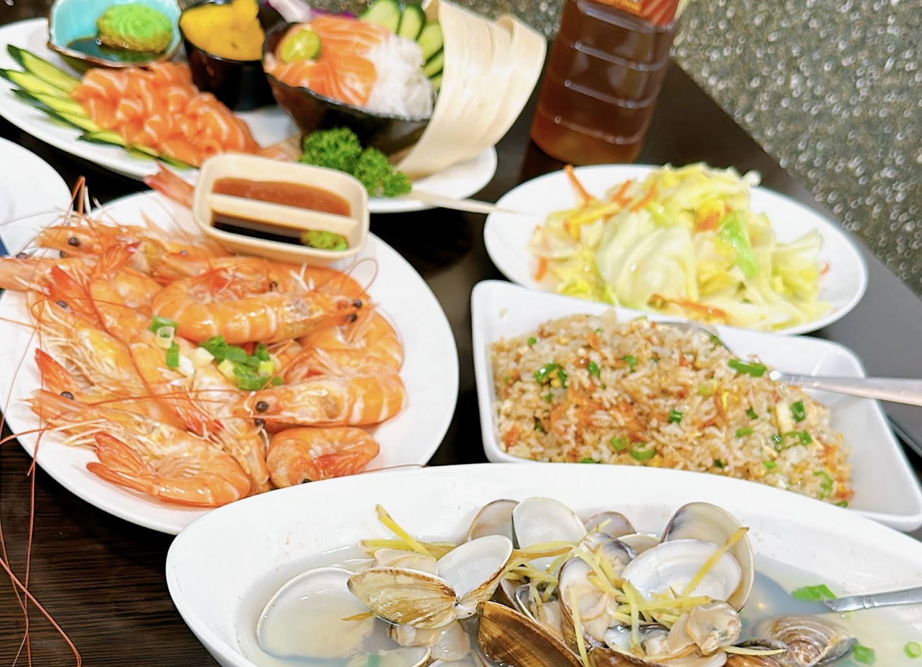 櫻花蝦炒飯, 三星蔥煎蛋, 綜合生魚片, 牛奶貝, 金沙中卷, 鮮魚湯, 川燙鮮蝦