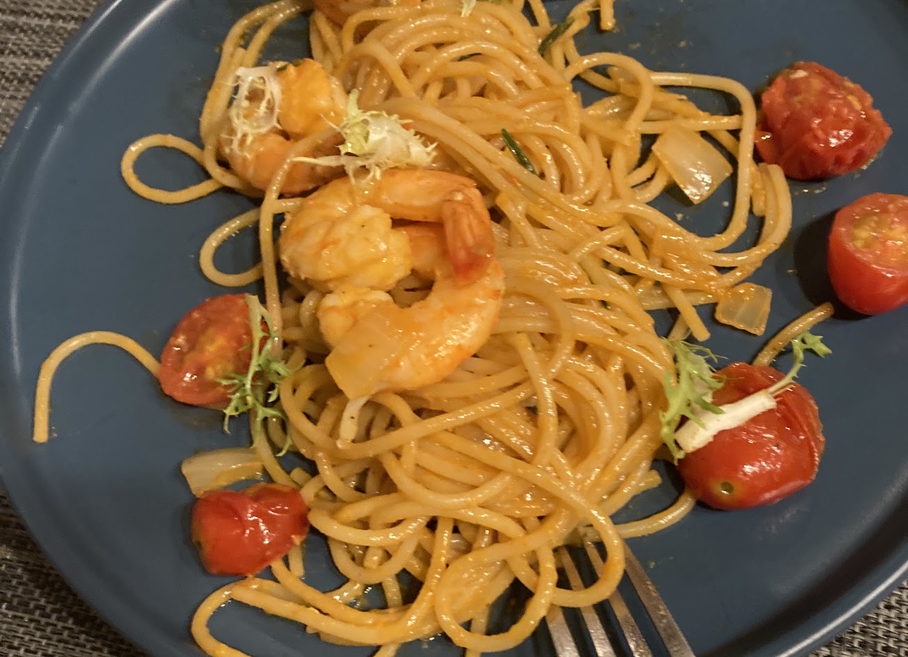 兩人到訪,點了蝦醬義大利麵、海鮮墨魚燉飯、生火腿哈密瓜芝麻葉沙拉及南瓜蔬菜濃湯,每一道都非常好吃,有豐富的風味及口感,份量上也充足。