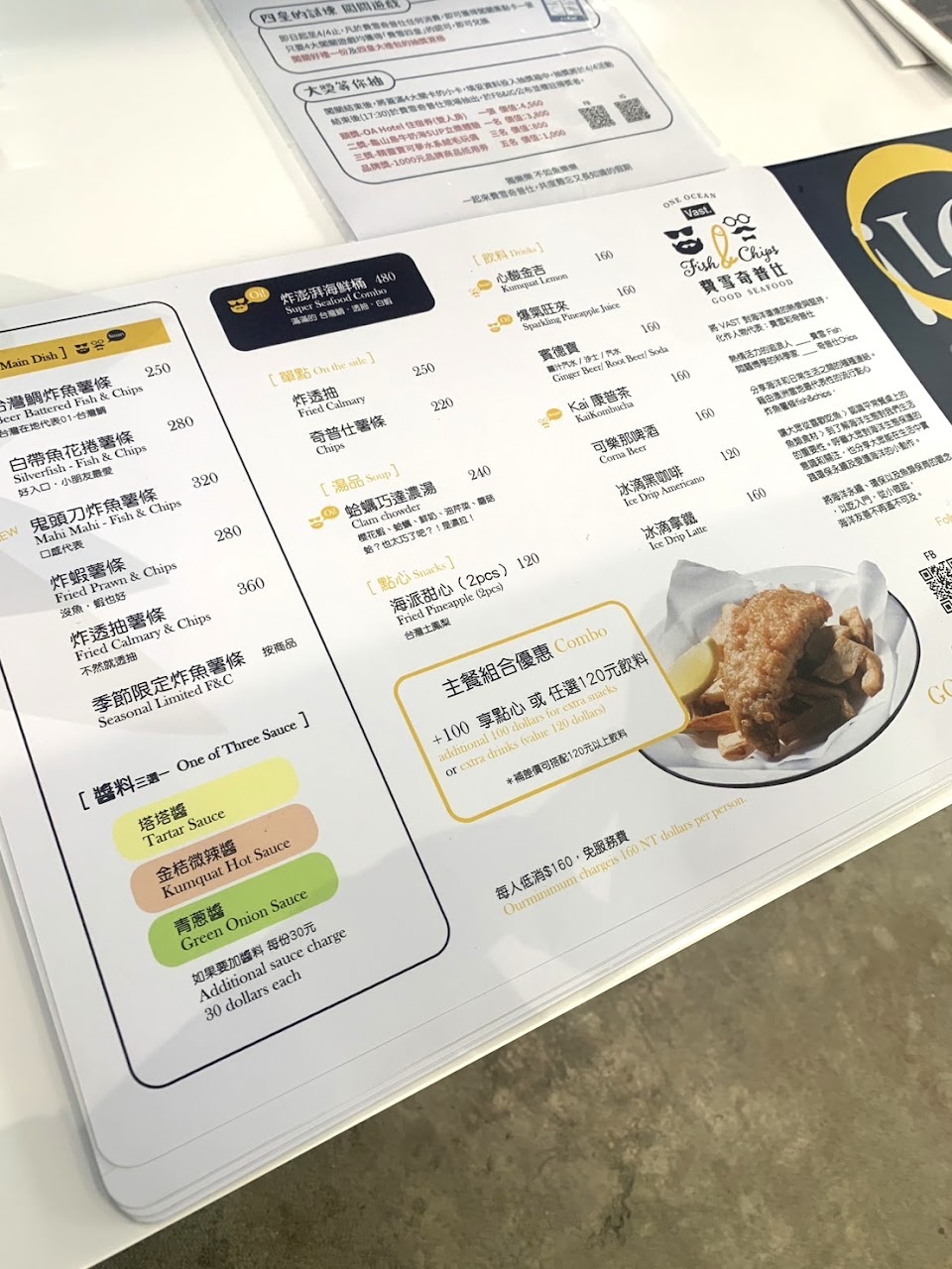 複合式的概念店 , 廚房和用餐環境都非常乾淨,飲用水也是很大方的薄荷加上檸檬切片,很好喝~也很解炸物多少帶來的膩感。塔塔醬和辣醬都是店家自行做的,吃得出來用心而且真的很好吃~炸魚也炸得剛剛好不會乾柴麵衣也不會太厚,薯條則是不規則的薯塊,配沾醬真的超好吃~