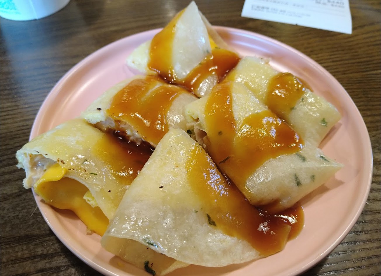 起司蛋餅中規中矩,沒有太特殊,蘿蔔糕用炸的,最近吃到幾家早餐店用這種方式處理蘿蔔糕,外酥內嫩,口感的確不錯