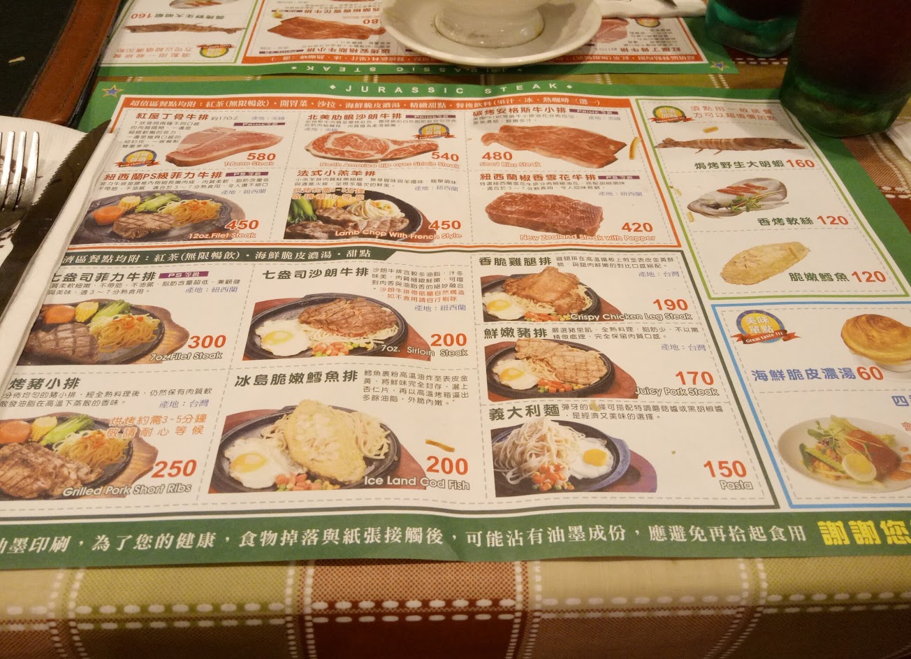 3/27晚上我們總共4大1小用餐,坐一樓,我點的是菲力(整塊都是筋),上餐後,我切一小塊給小朋友吃,看他咬很久不過還是噎到了,趕緊拍他的背讓他把肉吐出來!可能加上又有點暈車,肉吐出來後整個大吐,去請服務生幫忙清理時,因為假日人有點多(她的態度也很好),她請我稍等一下,但也很快就處理好了!(回來後才發現菜單上有寫~不帶筋?!)