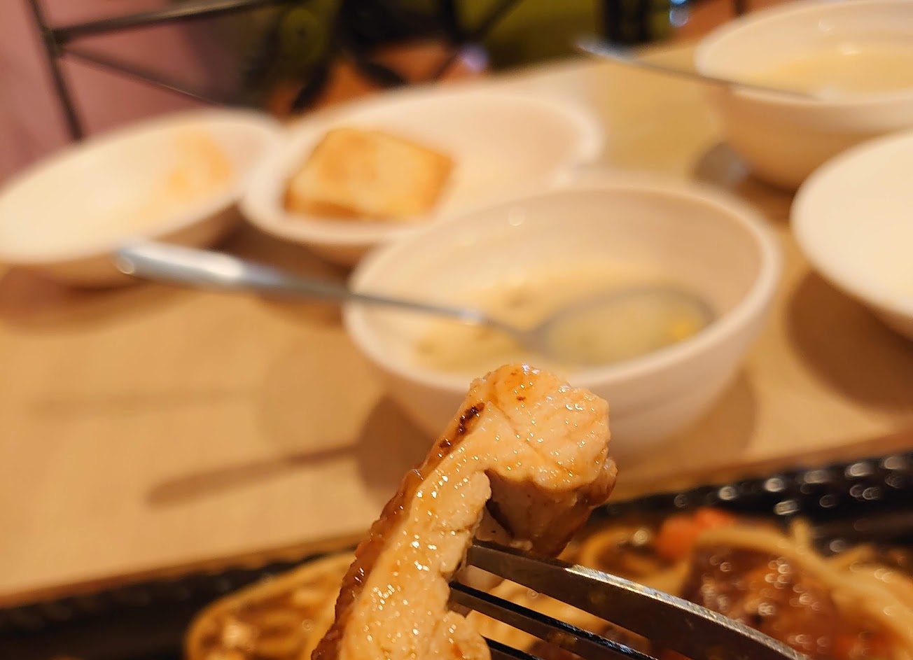 個人覺得排餐還可以,比較喜歡鐵板麵。前菜沙拉搭配千島醬很好吃,內用的自助吧有玉米濃湯和烤吐司,加上一大壺紅茶,CP值極高??? …