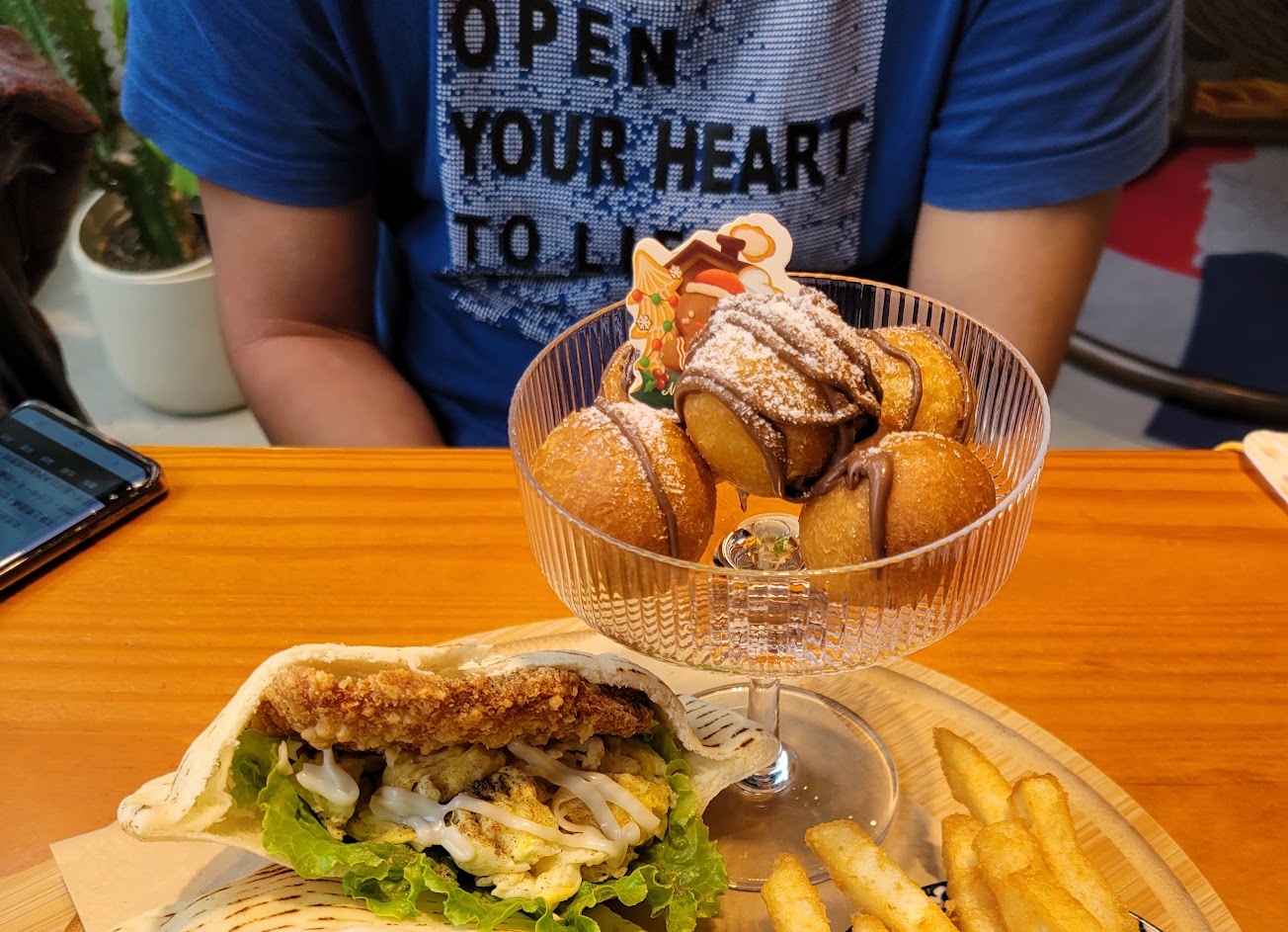 睽違2年的二訪,生意看起來不錯,季節性菜單依舊有再做更新,這次就點了聖誕套餐,因為他有一般早午餐少見的口袋餅,餐點來後才發現原來有兩種口味豬排和海鮮,厲害的是裡面竟然都沒有加醬料(滑了其他人評論才發現有醬),幸好豬排有醃料味,不然我快吃不下去,套餐算是鹹甜合併,小米球好吃但上面巧克力醬不好吃,幸好最後的泡芙有搶救回來一定,總結我覺得應該是在走網美路線,所以餐點沒驚豔處也是正常的!