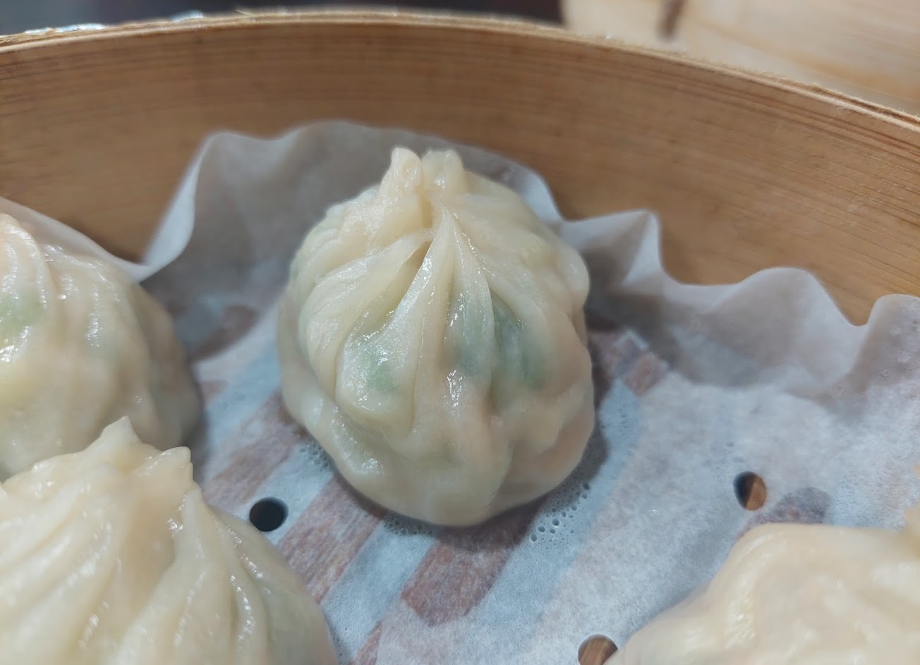 真的皮薄 折數多 餡料口味調的很棒 尤其滿滿蔥味, 綠色的燒賣更是驚人 內餡肉很扎實滿滿的韭菜 比很多港式餐廳的還好吃, 可惜~當天沒有冷凍可買回。