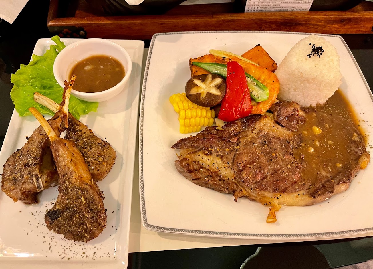 今天點了松阪牛和雞腿排,牛肉軟硬適中,連牙口不好的也咬得動,碳烤香味十足又不會太焦。排餐裡的配菜也烤得清爽好吃。雞排香草味道十足,完全不油膩。蔬菜湯完全沒有油,但超級清甜。老闆很大氣,去油膩的果醋可續杯。