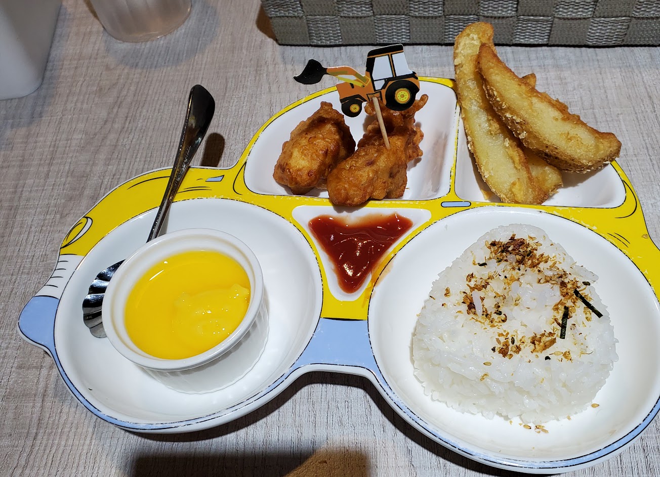 點餐是使用手機點餐,要註冊會員耗時,現場直接請店員代點亦可。兒童餐多是炸物,其他配菜是點綴,建議蔬果可多些,米飯為長米較乾硬,羅宋湯過鹹且賣相不佳,作為兒童配餐湯品,不可口。 成人的咖喱餐,咖喱醬只有飯的三分之一,很難搭配白飯吃完,後面幾乎是靠炸物配飯,相較一般咖喱飯的認知有落差,咖喱醬建議增加一倍,炸雞肉塊軟嫩,是吃完印象比較深刻的食物,主餐的蔬菜同樣偏少,底下鋪生高麗菜,生菜味重,類似擺盤用菜,用燙熟的青江菜更好吧?!只能說未能符應價位的配菜。 整體價位偏高,均需加價才有湯品。一大一小的主餐,加上10%服務費近500元。優點是平日用餐情境佳,離車站方便。 服務 內用 餐點類型 午餐 平均每人消費金額 $200-400 餐點:3 服務:3 氣氛:5 建議的餐點 唐揚炸雞鐵板咖哩蛋包飯 唯一會吃的商業午餐