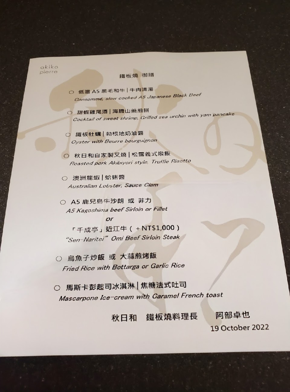 一訪鐵板燒,店家服務很用心,訂位時有先告知部分食材無法食用,會主動電話溝通討論提供客製化菜單,很令人驚艷。超級推薦鹿兒島及近江牛沙朗,口感軟嫩入口即化,套餐中龍蝦及軟殼蟹都非常新鮮美味,烏魚子炒飯及大蒜煎烤飯香氣很足,很想請阿部主廚再炒一些?
