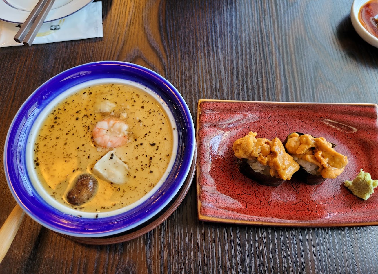 海鮮茶碗蒸,有兩隻鮮蝦及干貝等食材,最上面的茶碗蒸醬汁一起搭配非常香,蒸蛋本身也非常細滑好吃,份量也比想像中大碗。 蛤蠣清湯,很重要的一點是蛤蠣們都有吐沙吐乾淨,真的太好了,最討厭吃到沙沙的口感,且蛤蠣都還是在剛起鍋澎澎的最好的狀態。