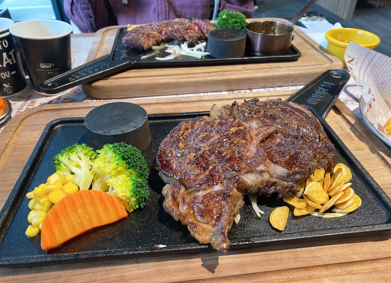 點了安格斯肋眼牛排&A5和牛,肉質軟嫩~建議的熟度剛好,附加熱岩石可再自己炙燒,簡單搭配蒜片及玫瑰鹽就很好吃!像菜刀的餐刀頗富趣味(不自覺想剁肉? – 自助吧部份 飲料:茶、沙瓦及鮮榨柳丁汁(又甜又新鮮) 湯:玉米濃湯(普普)、羅宋湯(牛肉給的大方放很多,也添加許多蔬菜,喝起來不油膩,會想一直續),旁邊提供泡菜&醃蘿蔔小黃瓜解膩 – 用完餐旁邊還有冰淇淋,本來很想續冰,服務人員客氣的告知用餐時間到了作罷,整餐吃下來90分鐘對進食較慢的人有點不夠(幸好有把部份的主餐給朋友,不然應該吃不到冰) 另外~前次訂好位,臨時通知店休保養要取消訂位,在此次用餐時特別說明原因並招待一份水牛城辣雞翅,小小行為讓人感到大心 btw座位旁剛好是垃圾子母車?