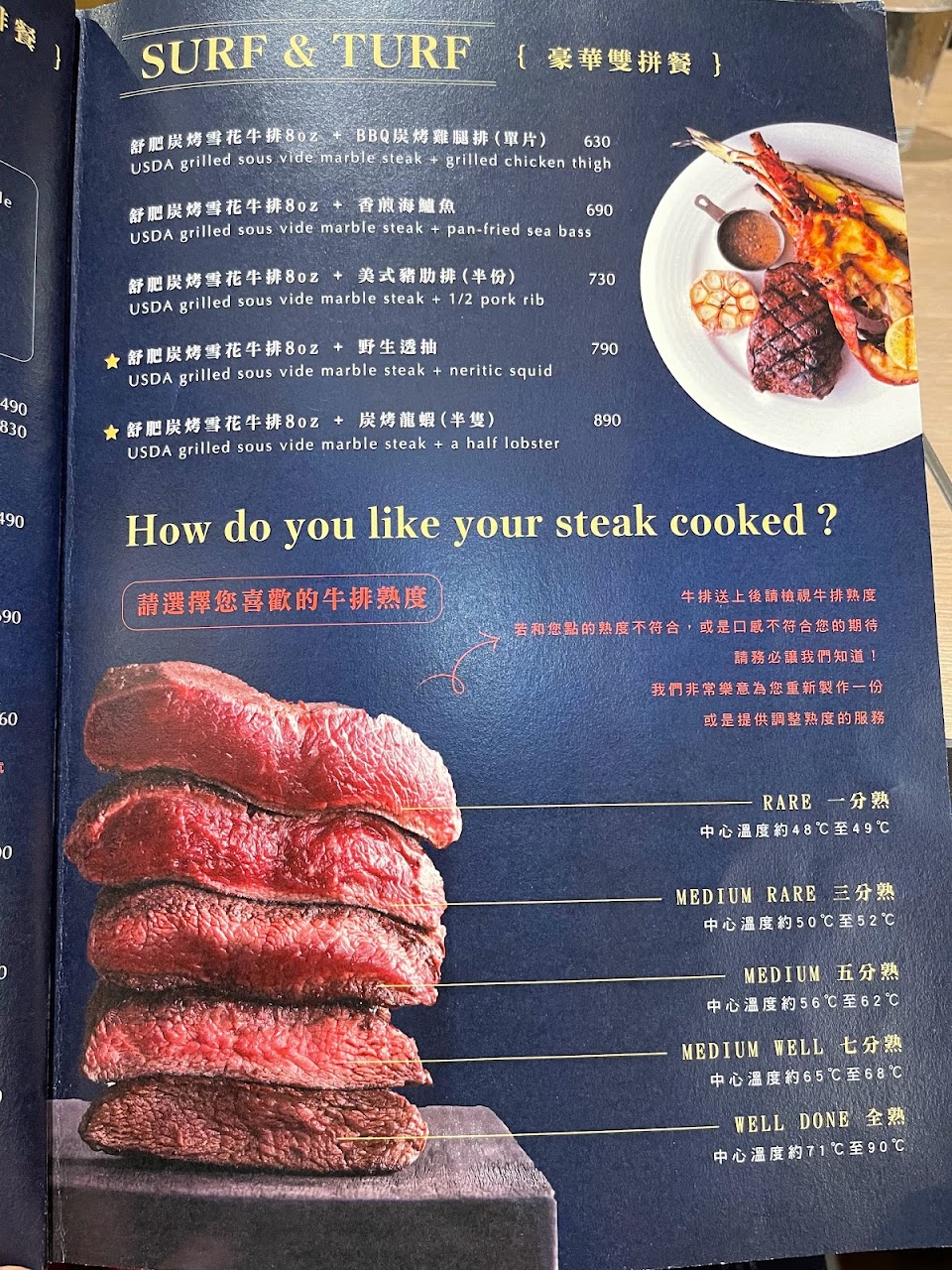 餐廳主打的是牛排,採用的是美國自然牛冷藏PRIME、CHOICE等級的牛肉,再使用龍眼木炭烤成排餐,讓每一口肉肉都有獨特誘人的香氣。